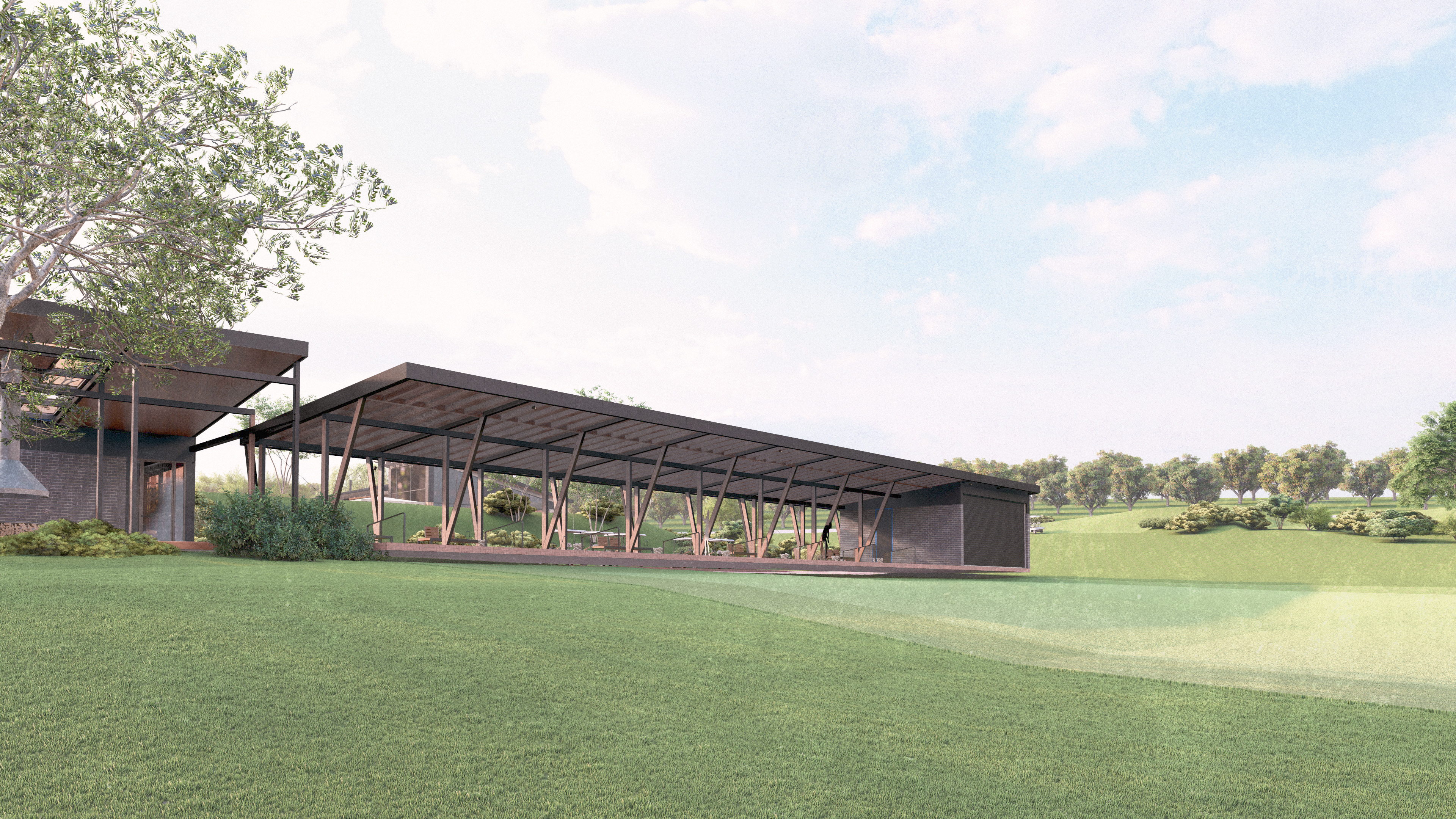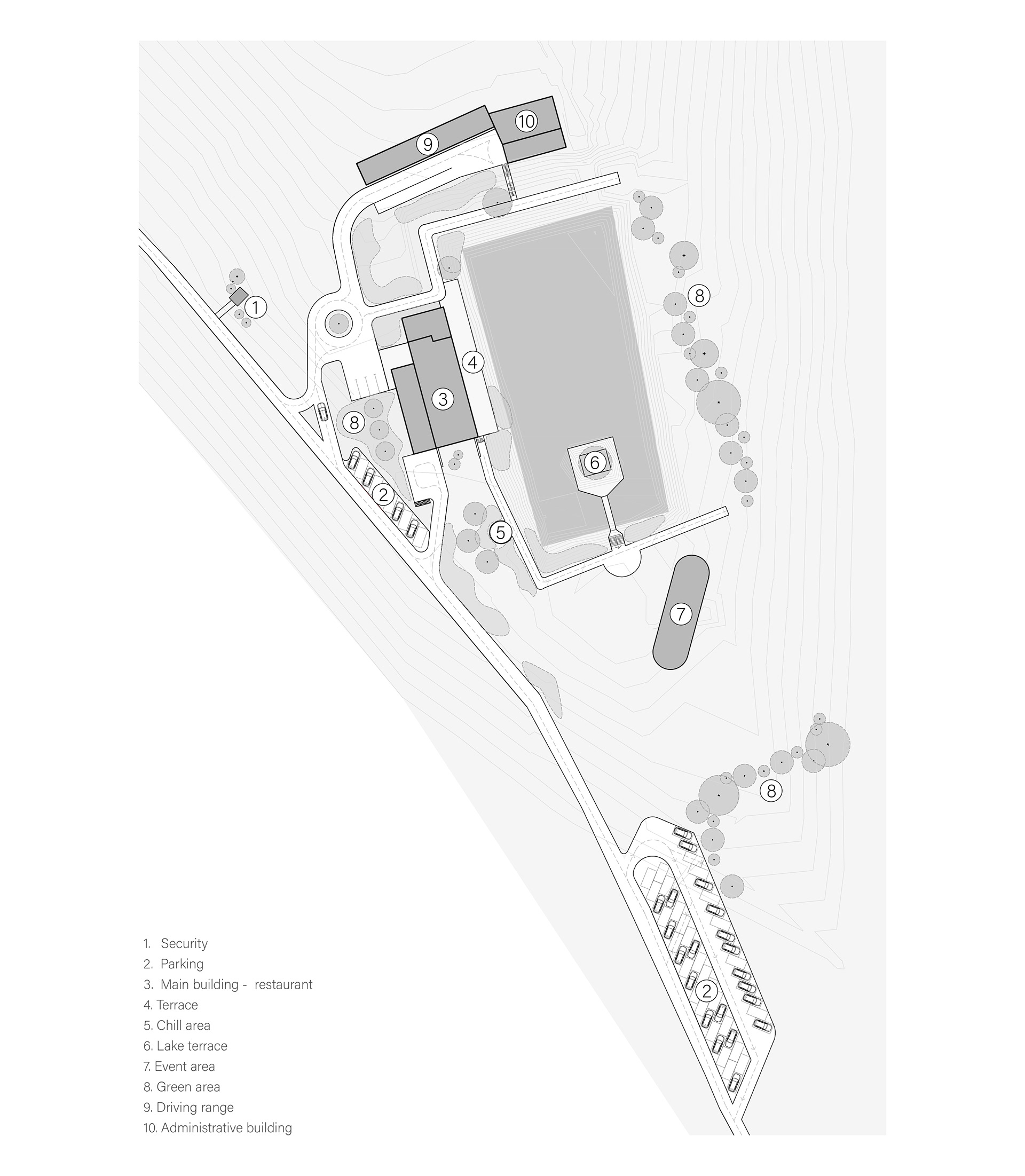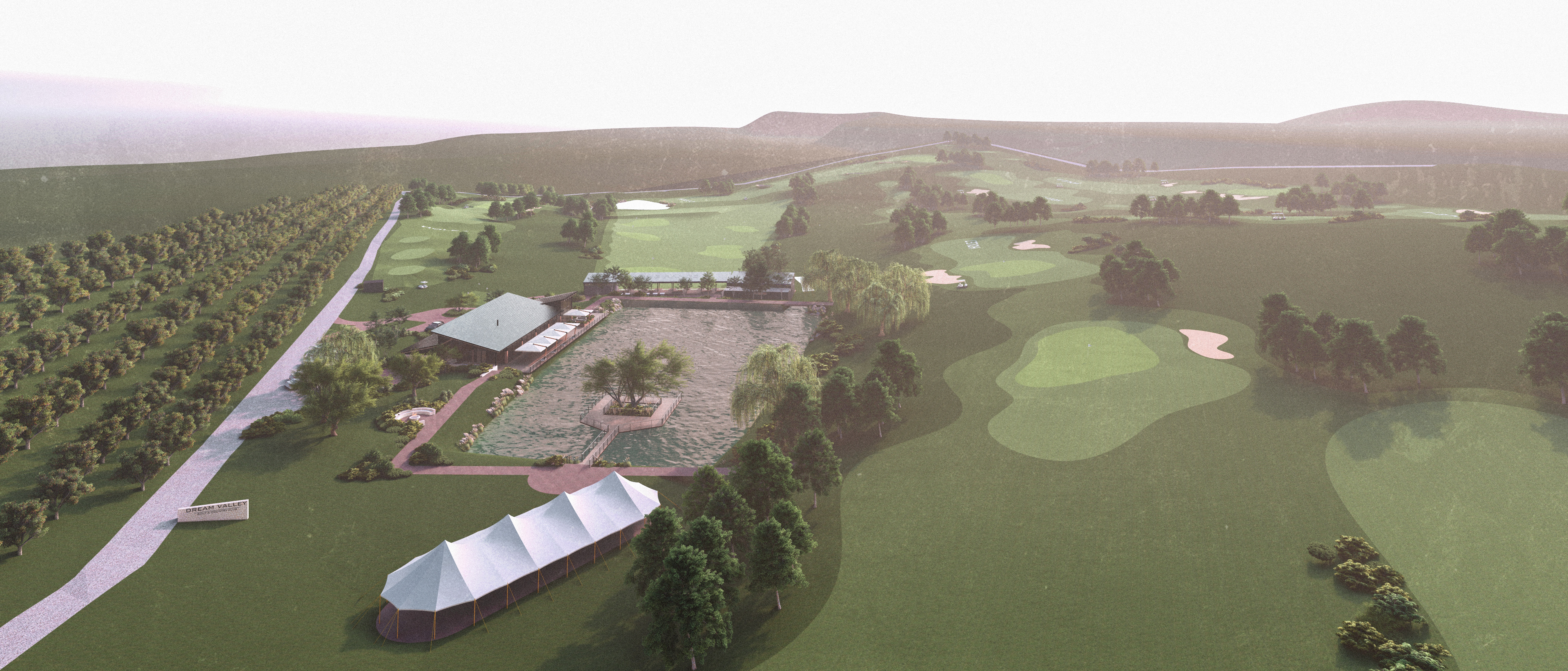 Dream Valley Golf & Country Club is a phased leisure development set within a natural landscape defined by gentle hills and open views. The masterplan is organized around an artificial lake, which acts as the central element both functionally and visually. Around it, the main components of the complex are arranged: a lakeside restaurant with terrace, the driving range practice area, the 9-hole golf course, an event space defined by a large tent structure, as well as outdoor relaxation areas and pedestrian paths that structure the relationship between water and landscape.