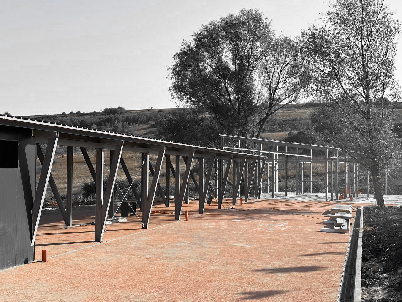 The first constructed phase included the driving range and the main pedestrian path paved in red brick, which serves as both an orientational and identity-defining element. Further phases continue the gradual development of the project.