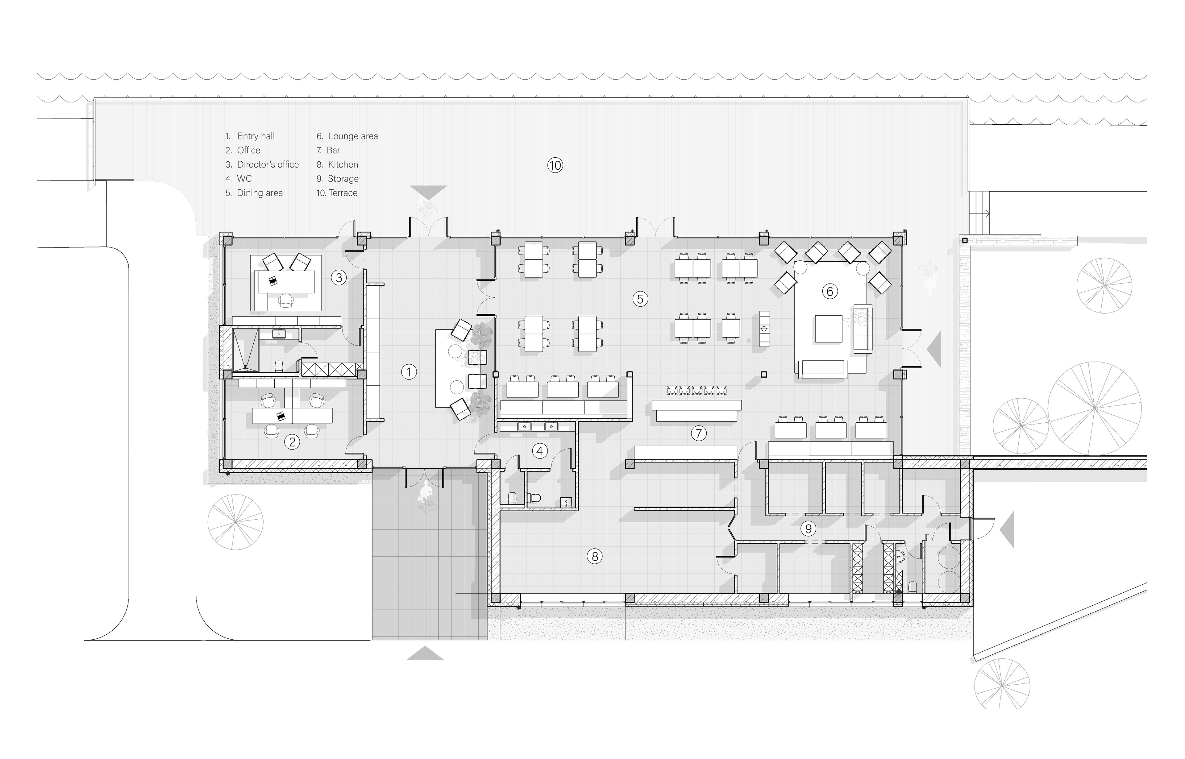 The interior includes a 54-seat dining area, complemented by a lounge and a bar, all configured within a fluid and cohesive spatial arrangement. The outdoor terrace unfolds along the water, functioning as a natural extension of the interior