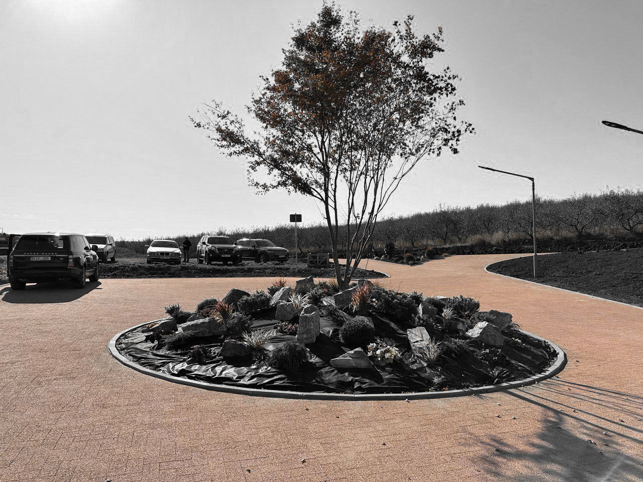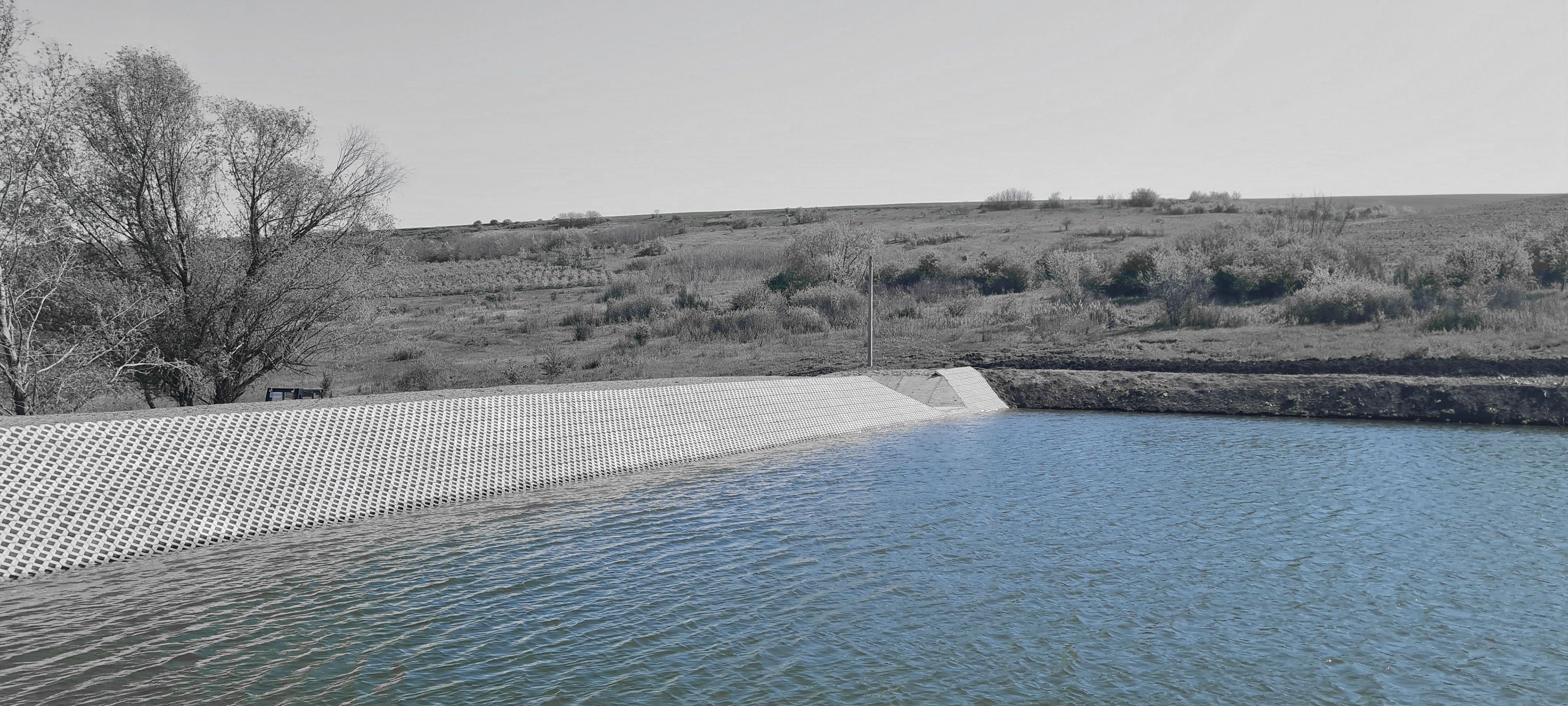 Lacul devine un element activ al compoziției: în mijlocul acestuia a fost păstrat un copac existent, în jurul căruia a fost proiectată o platformă-terasă accesibilă, creând un punct de interes și o destinație în sine în cadrul ansamblului. Această intervenție adaugă un strat suplimentar de experiență, transformând lacul într-un spațiu activ și nu doar contemplativ.