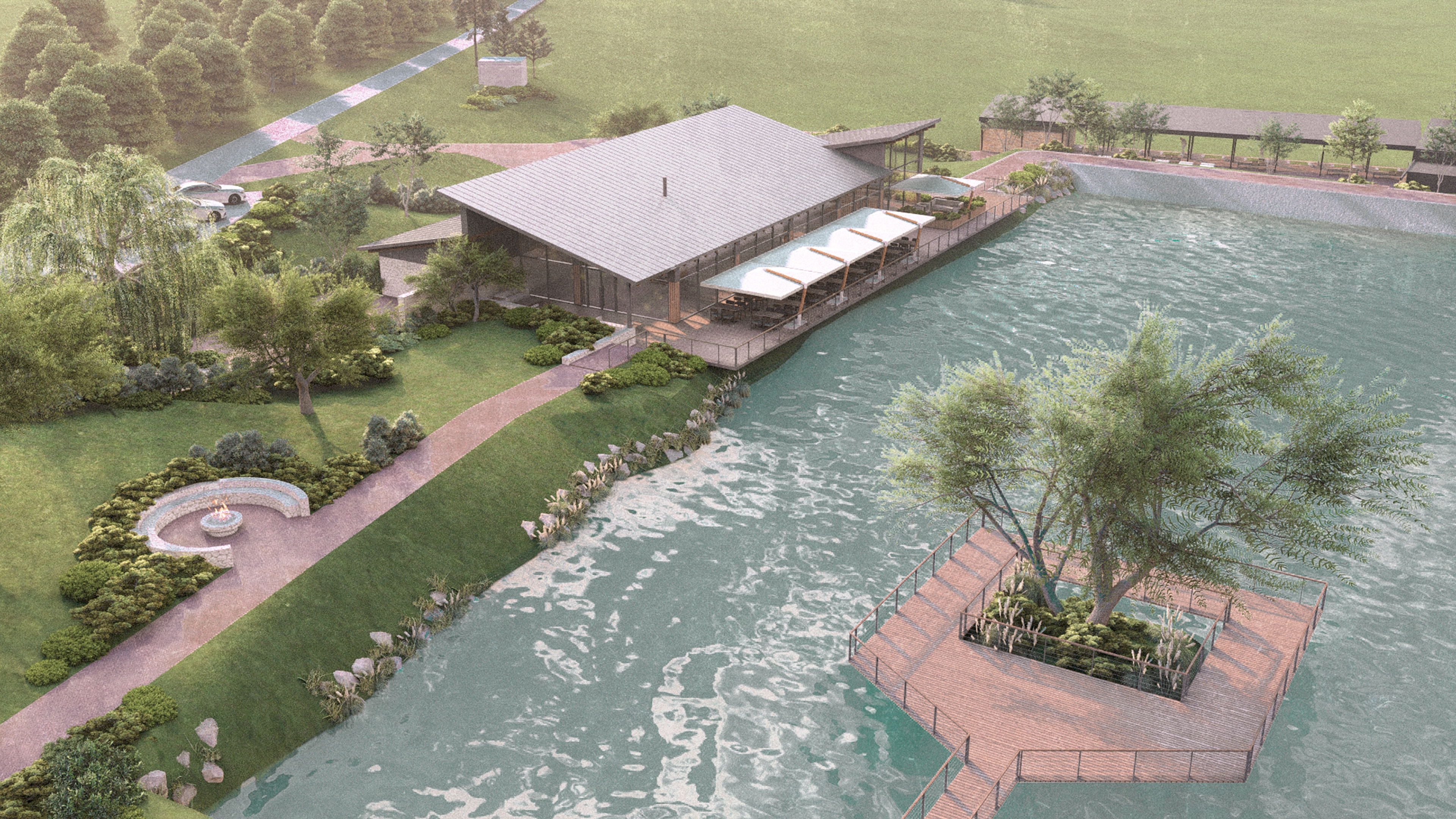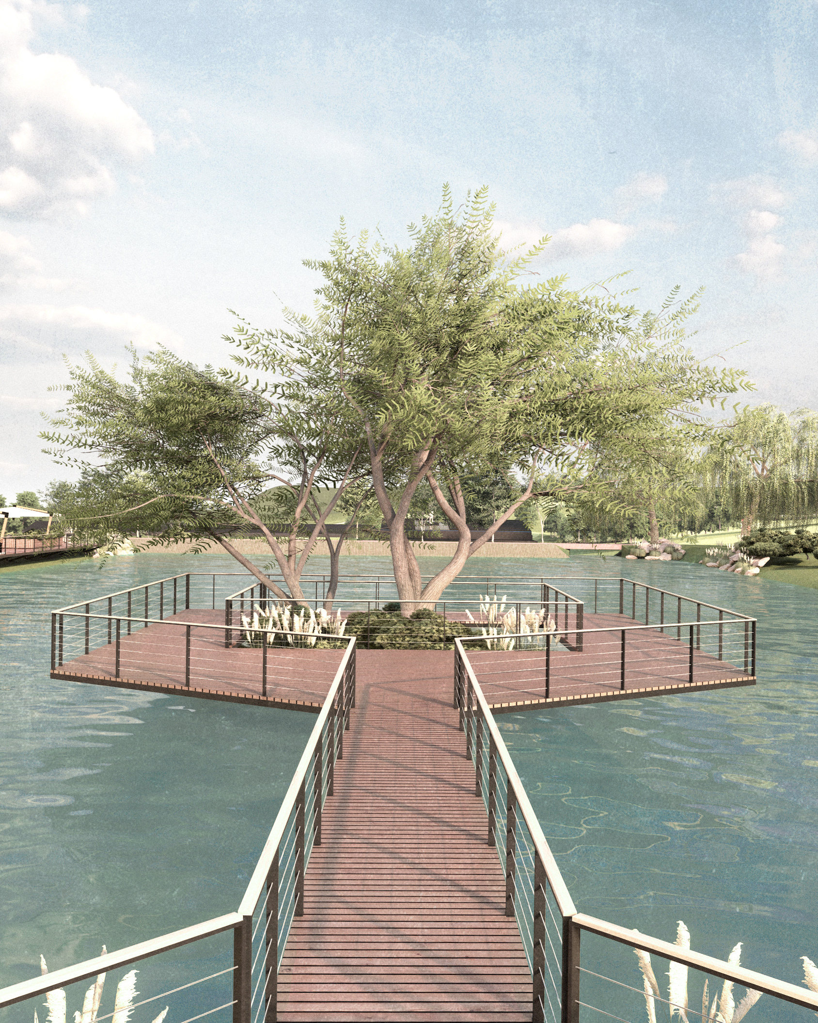 The lake itself becomes an active element within the composition. At its center, an existing tree has been preserved and integrated into a circular accessible platform, creating a focal point and a destination in its own right. This intervention adds an additional layer of experience, transforming the lake into an active space rather than a purely contemplative one.