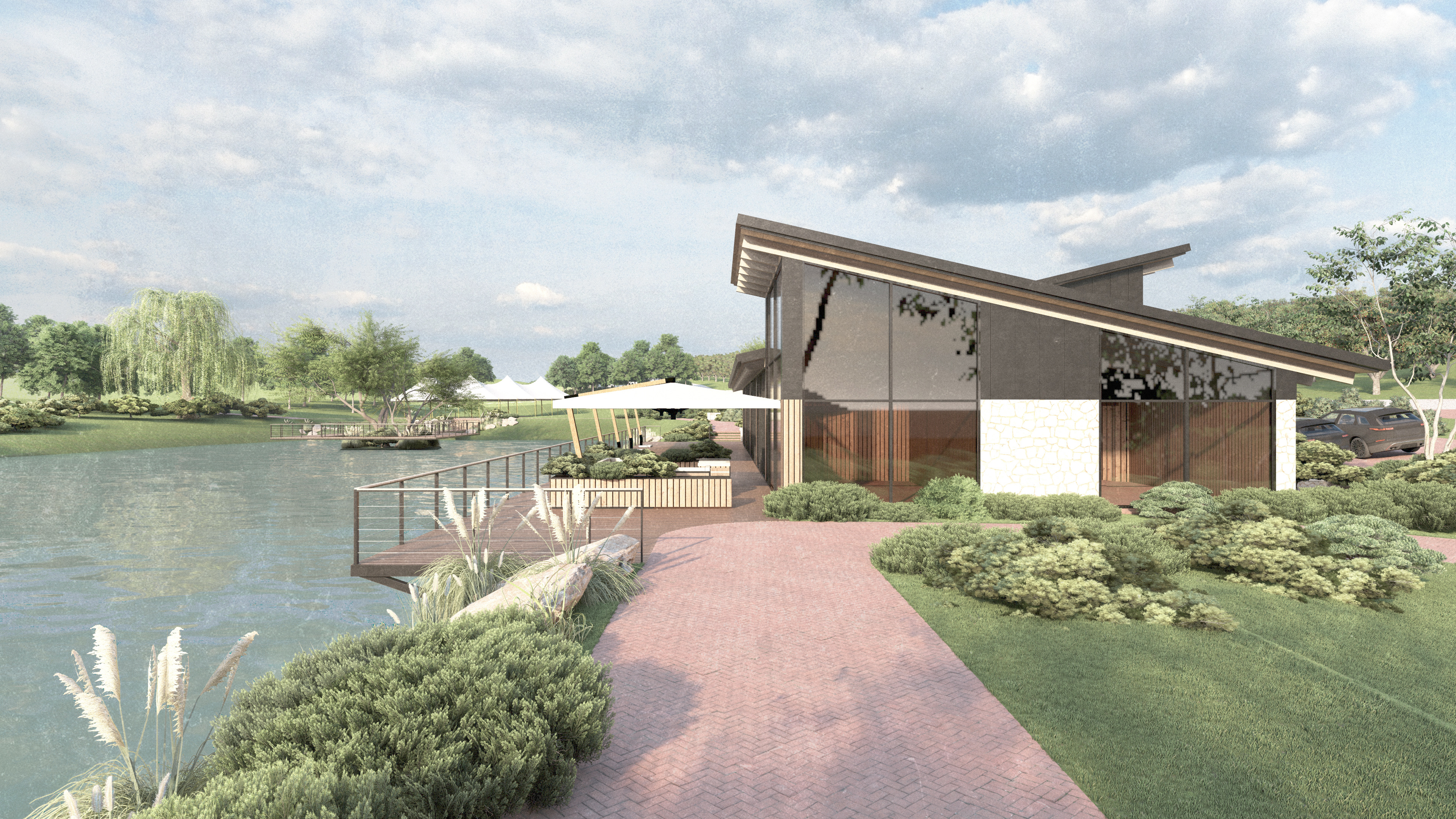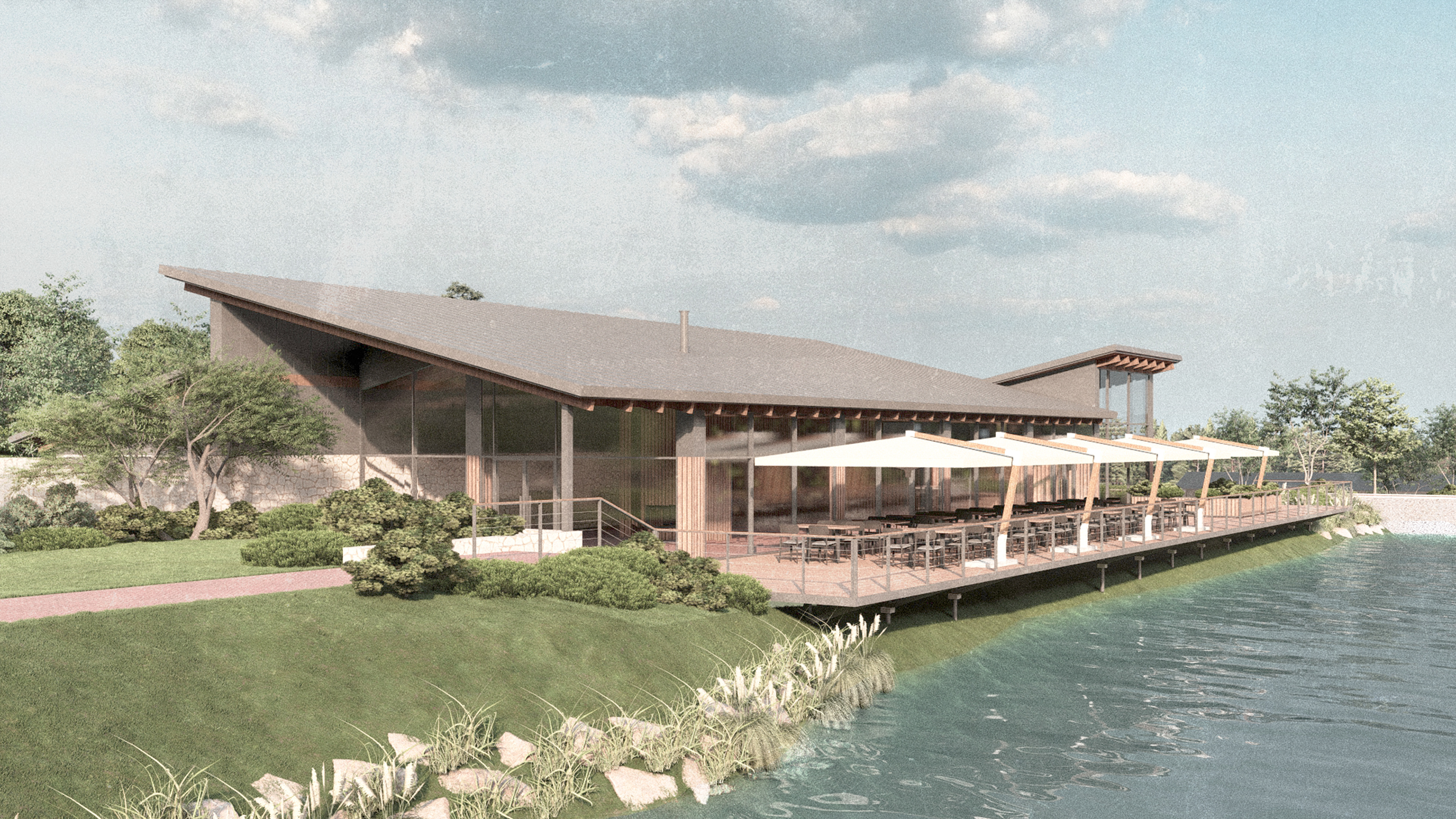 The restaurant is positioned along the edge of the artificial lake, conceived as a horizontal volume open towards the landscape, with generous glazing and an expansive terrace.
