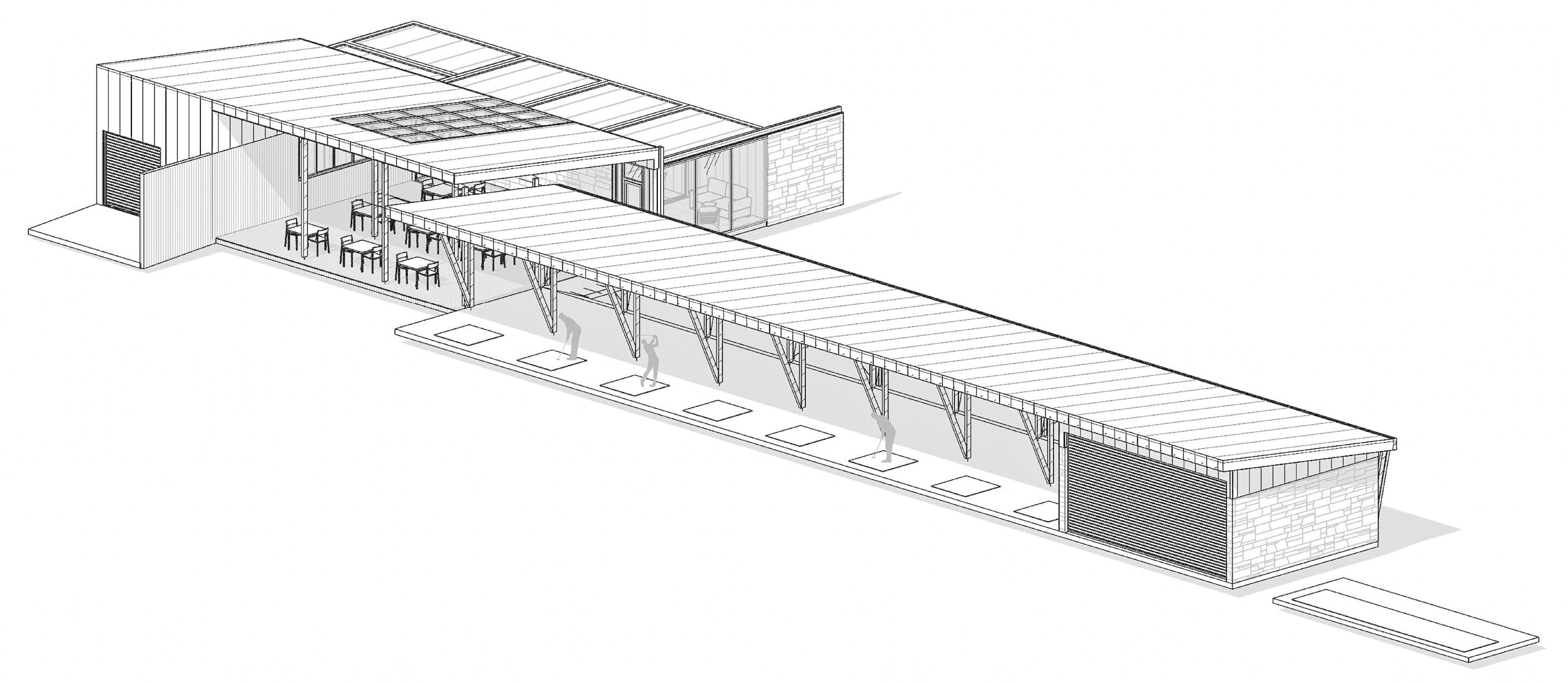 The driving range is designed for simultaneous use, featuring a series of 8 hitting bays oriented towards the open landscape. The layout emphasizes both functional clarity and user comfort, with each position benefiting from optimal visibility.