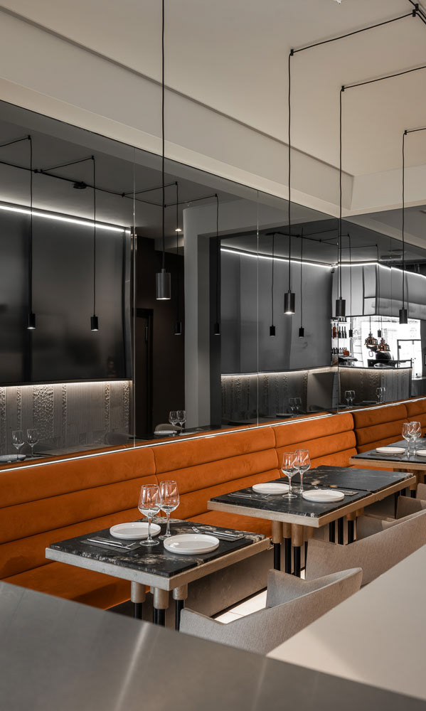 The bar counter is divided by a column into the beer bar area and an open kitchen area. Here, one can watch the preparation of the specialty of Pastarami Sandwich according to the original American recipe from the brisket Black Angus. For beer connoisseurs, the senior chef prepares a variety of raw-cured sausage stored in a special refrigerator with a glass showcase.