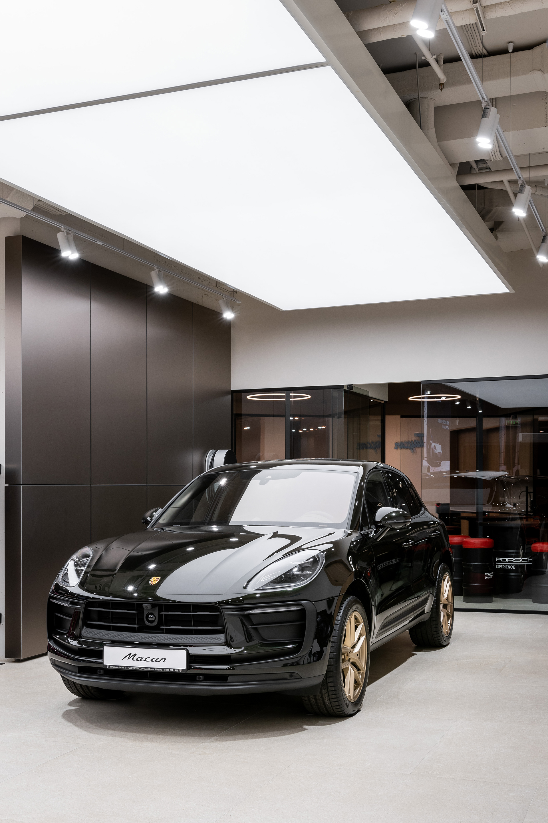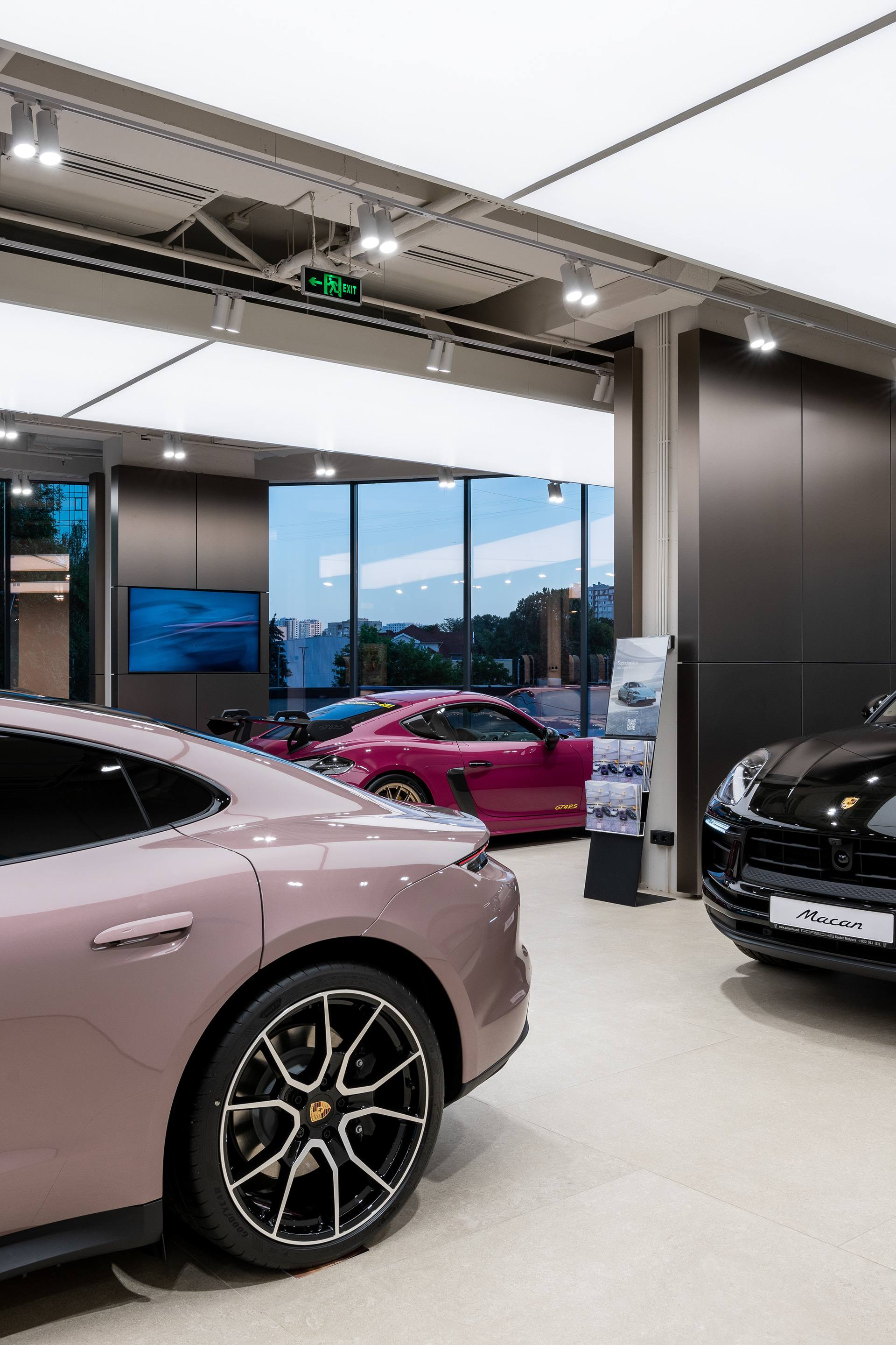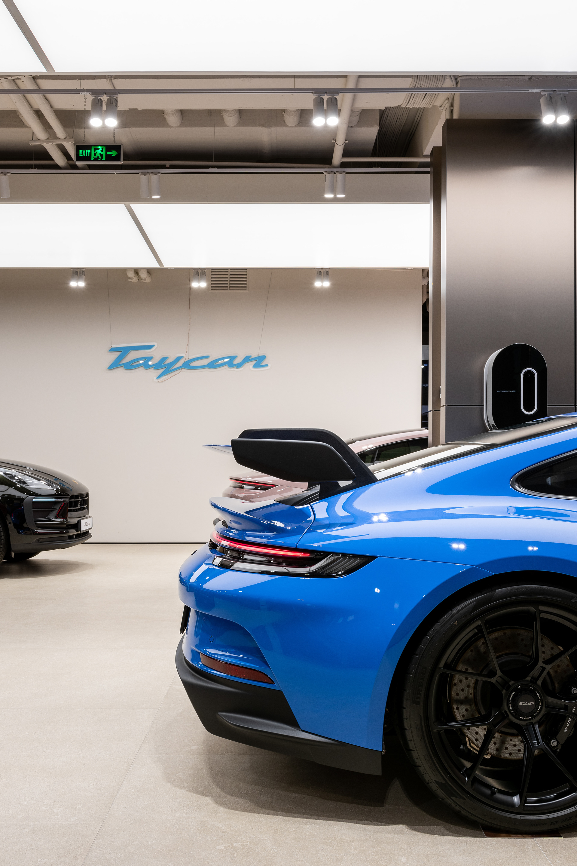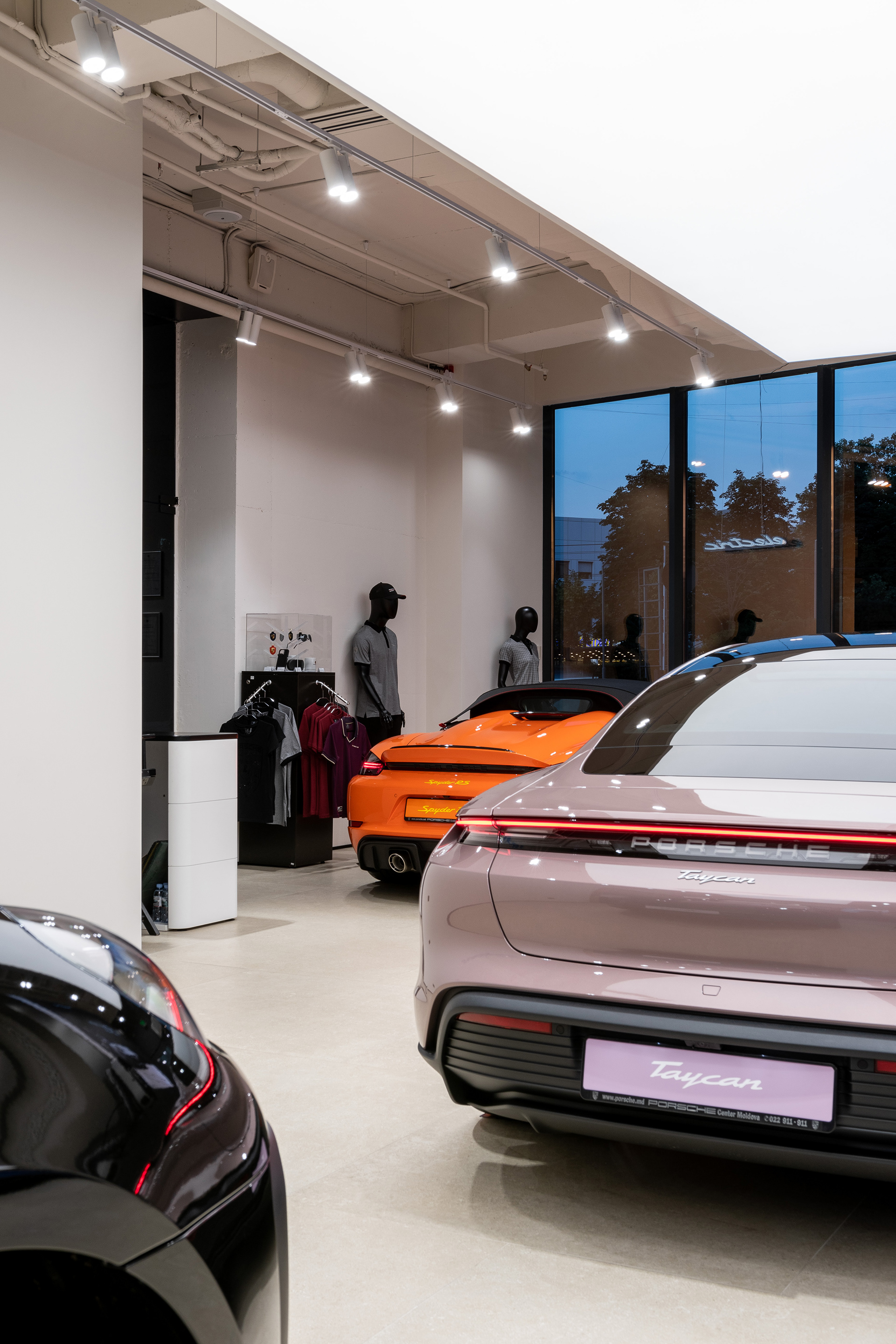 The photoshoot featured on our website illustrates how the interior does not take center stage—instead, it serves as a sophisticated backdrop that enhances the presence of the Porsche sports models, creating the perfect setting for their presentation.