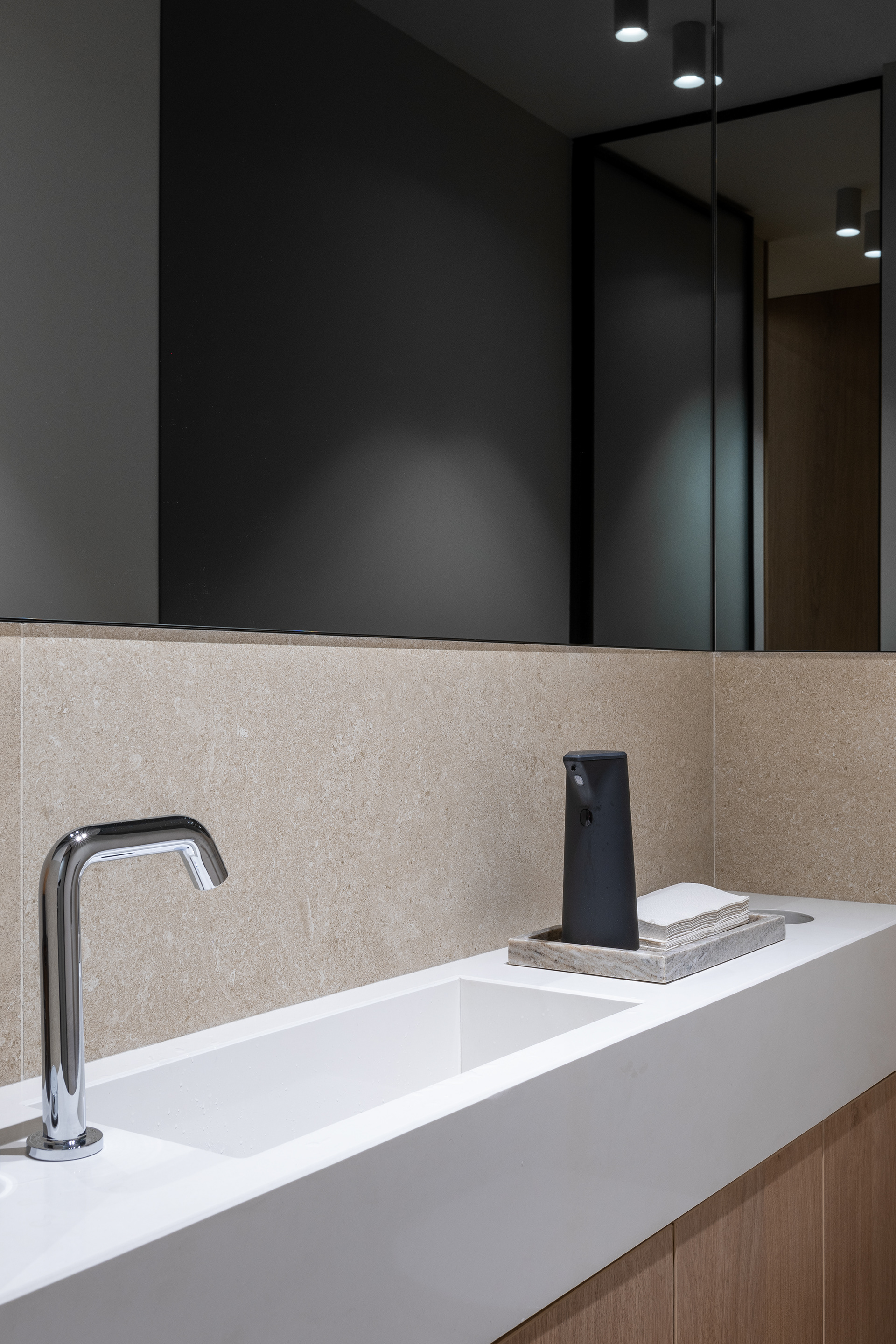 Interiorul este construit pe un contrast între estetica industrială și materialele rafinate. Betonul vopsit și sistemele inginerești expuse sunt juxtapuse cu panouri metalice elegante, pereți din sticlă și elemente de mobilier din lemn furniruit.