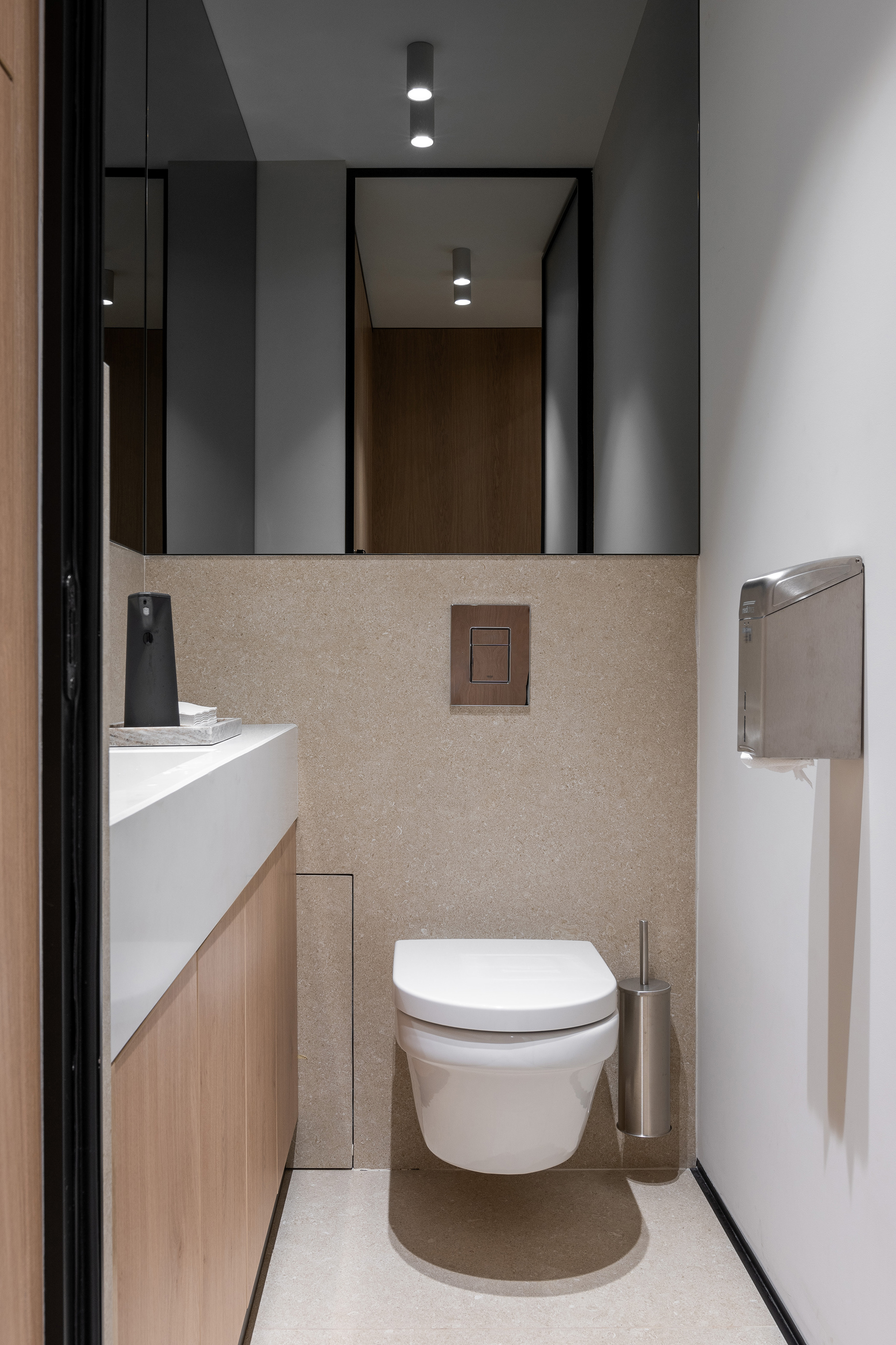 The interior is built on a contrast of industrial aesthetics and refined materials. Painted concrete and exposed engineering systems are juxtaposed with sleek metallic panels, glass partitions, and veneered wooden furniture elements.
