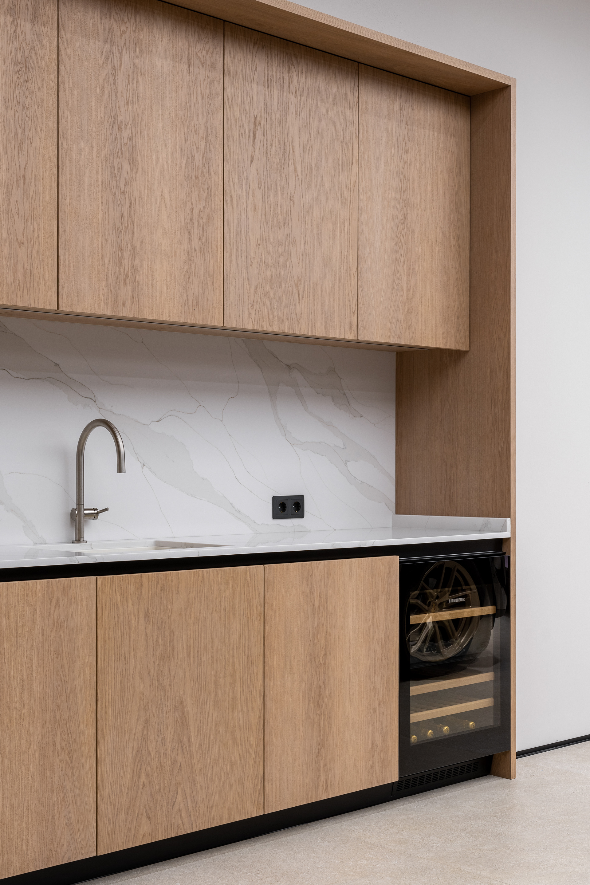 At the heart of the showroom is a flexible exhibition space. Towards the back, there are three private offices and a built-in kitchen equipped with state-of-the-art appliances. Behind the kitchen, technical areas include a wardrobe and restroom facilities.