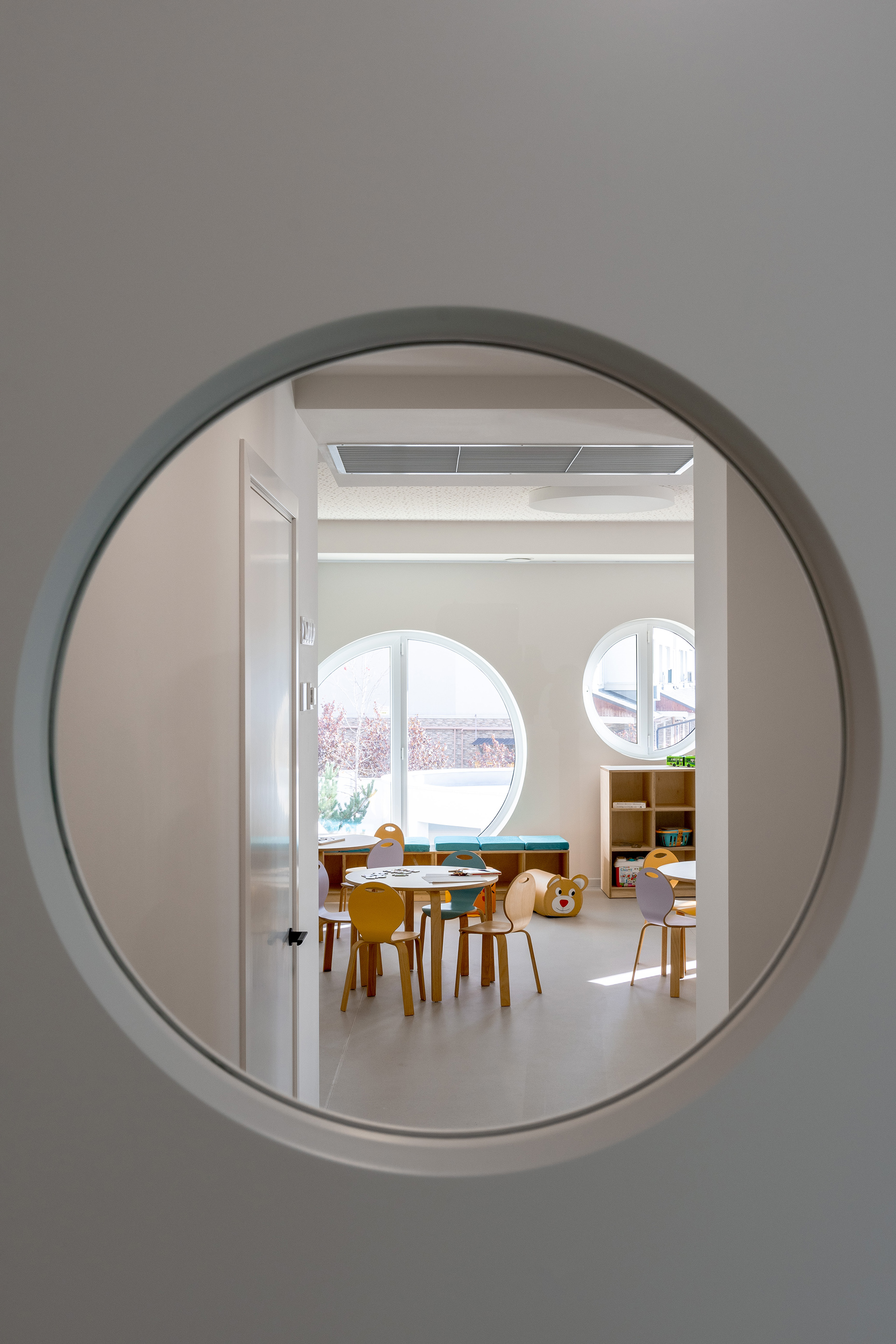 Classrooms are predominantly oriented towards the southeast and southwest, maximizing natural light intake. For acoustic comfort, perforated gypsum board panels and suspended acoustic panels have been used. Interior finishes are made of eco-friendly, durable materials, and the furniture is crafted from natural wood and plywood, ensuring a safe and welcoming environment for children.