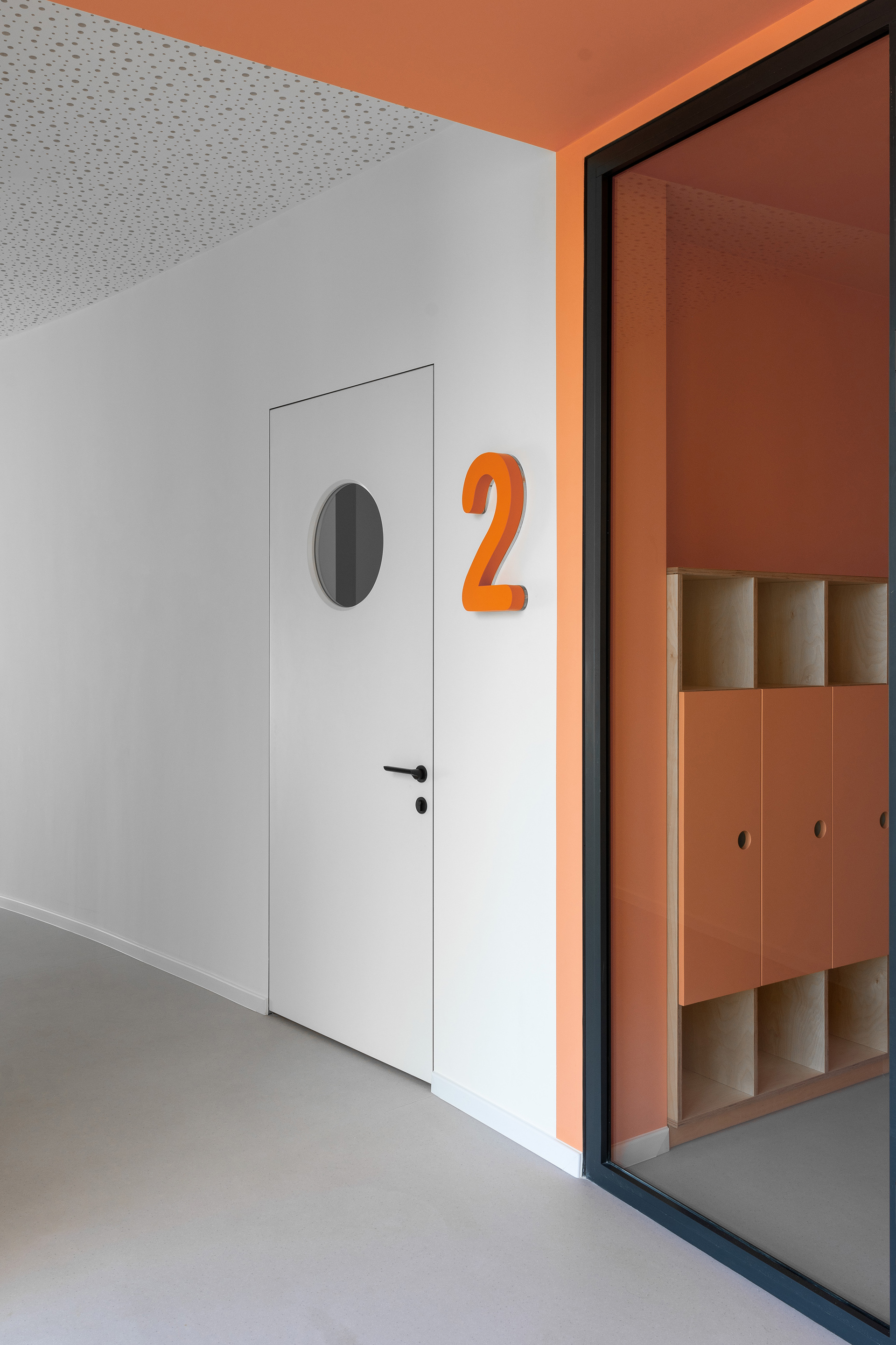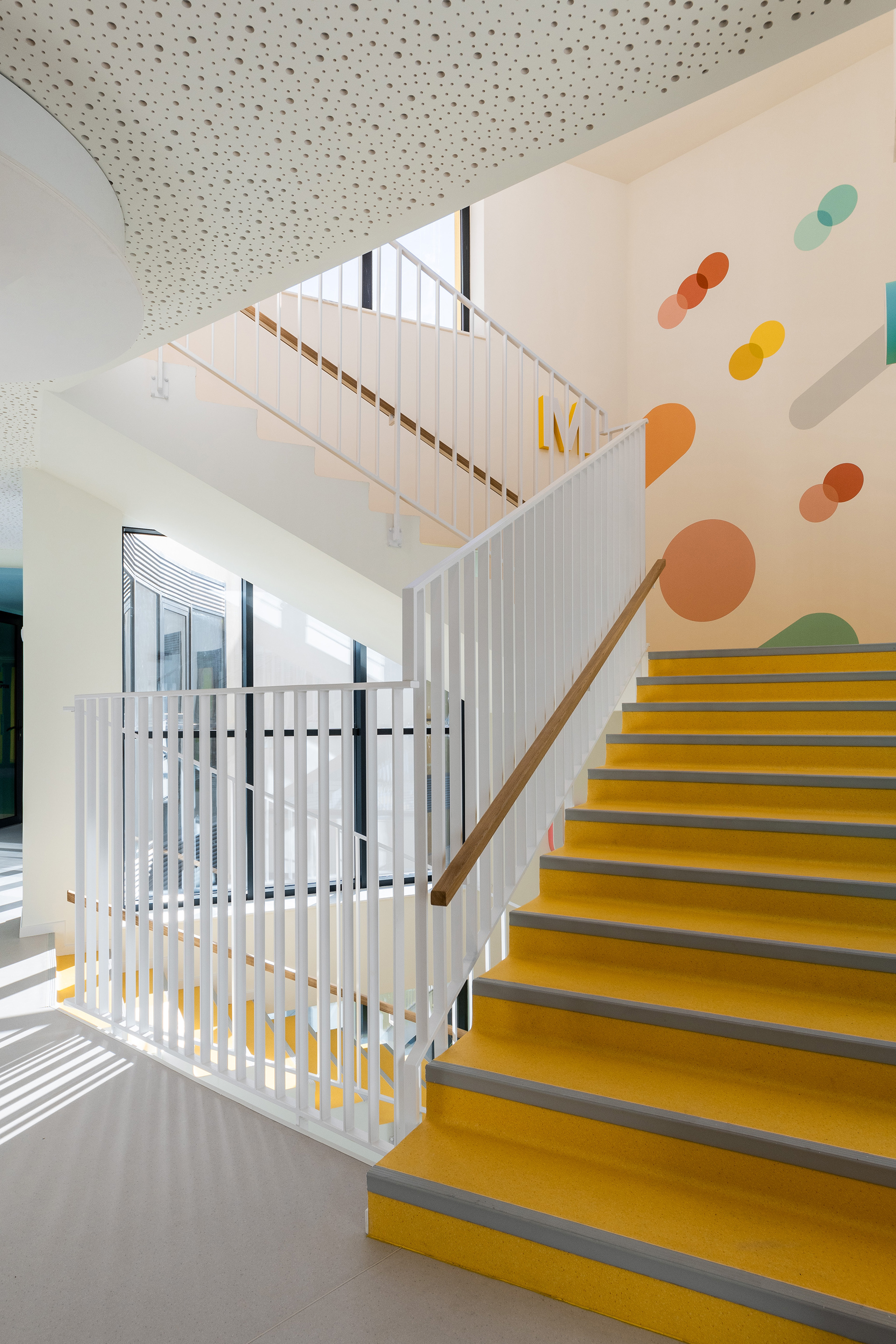 Sălile de clasă sunt orientate preponderent spre sud-est și sud-vest, maximizând aportul de lumină naturală. Pentru confortul acustic, au fost utilizate plăci de gips-carton perforate și panouri acustice suspendate. Finisajele interioare sunt realizate din materiale ecologice și durabile, iar mobilierul este confecționat din lemn natural și placaj, oferind un mediu sigur și prietenos pentru copii.