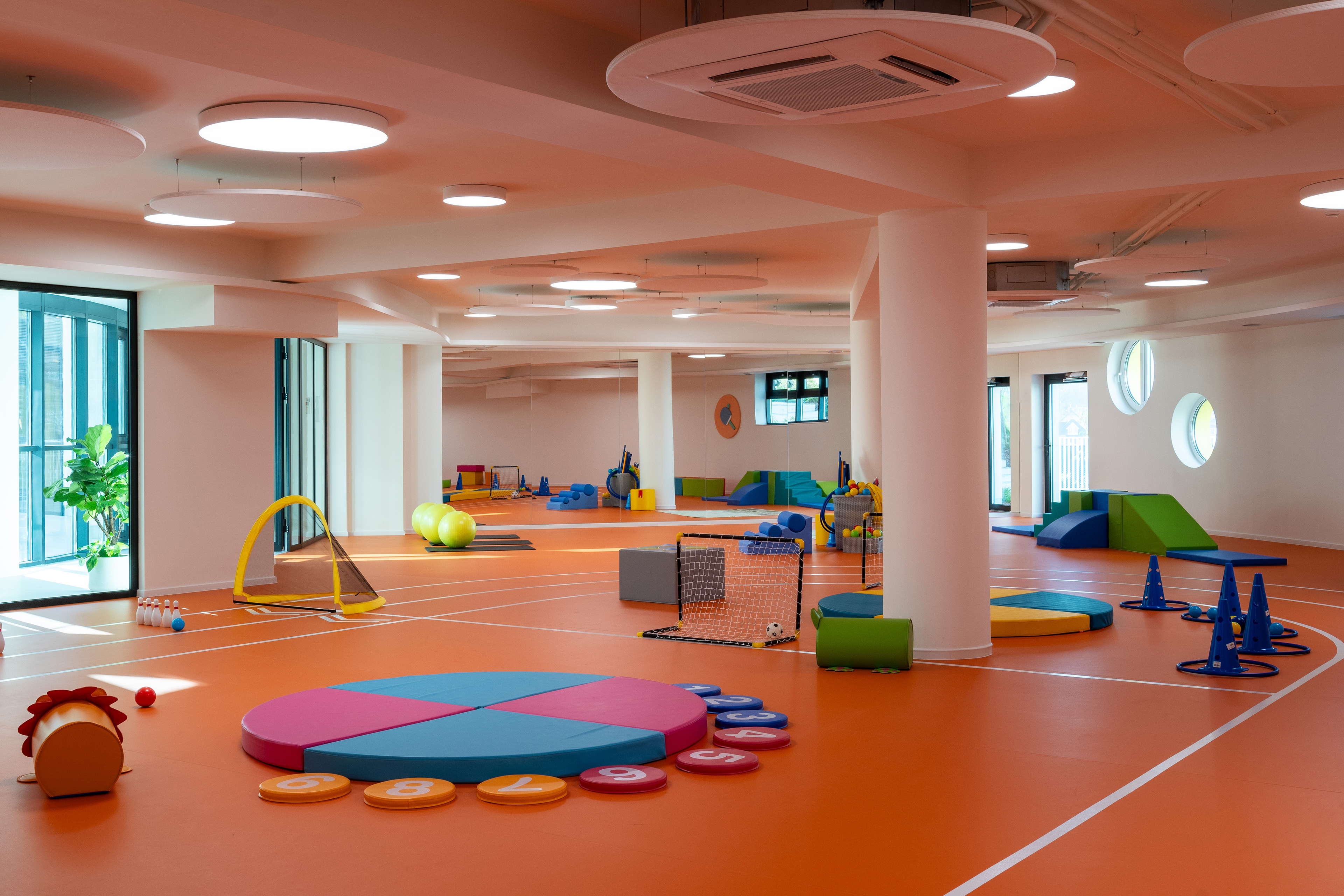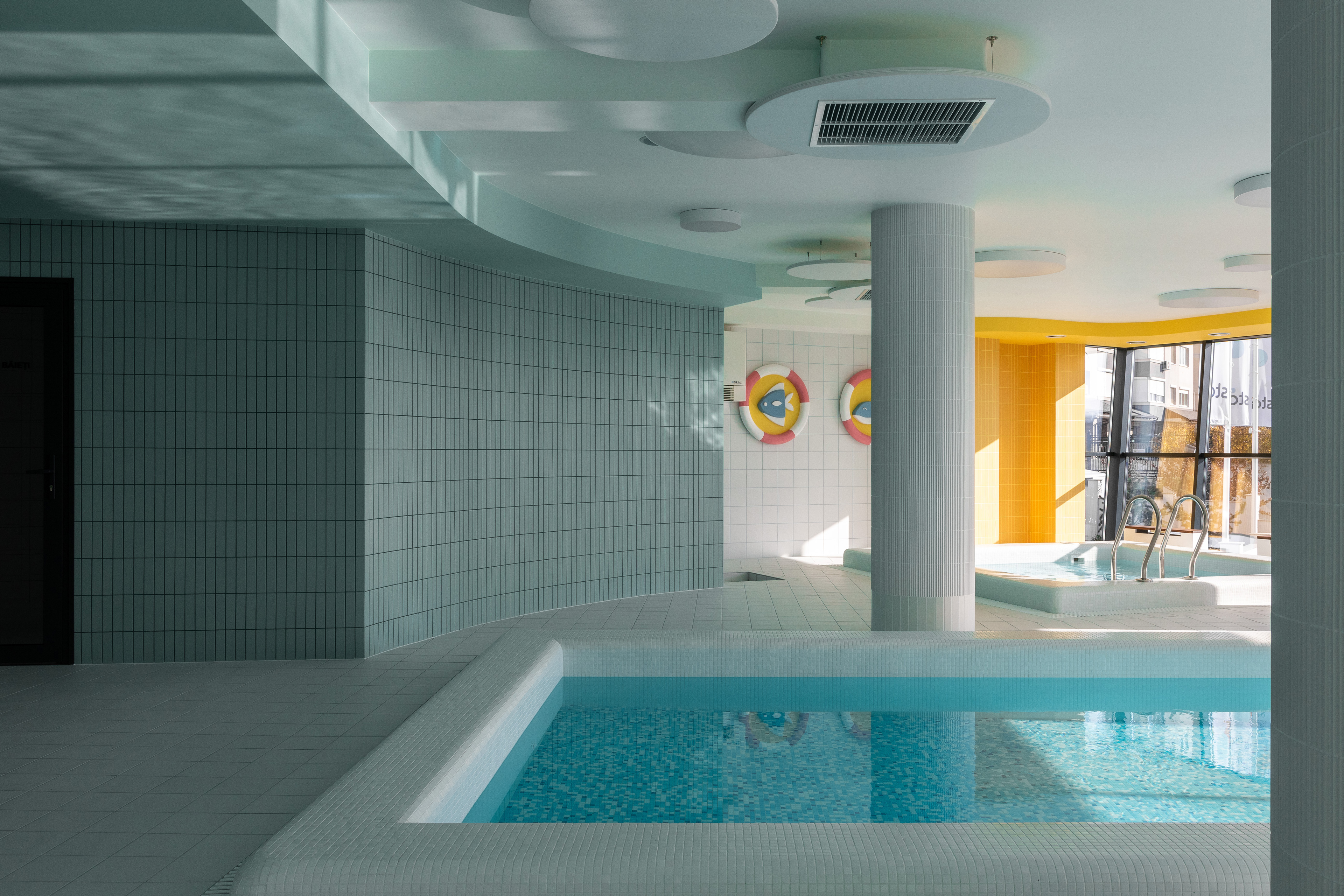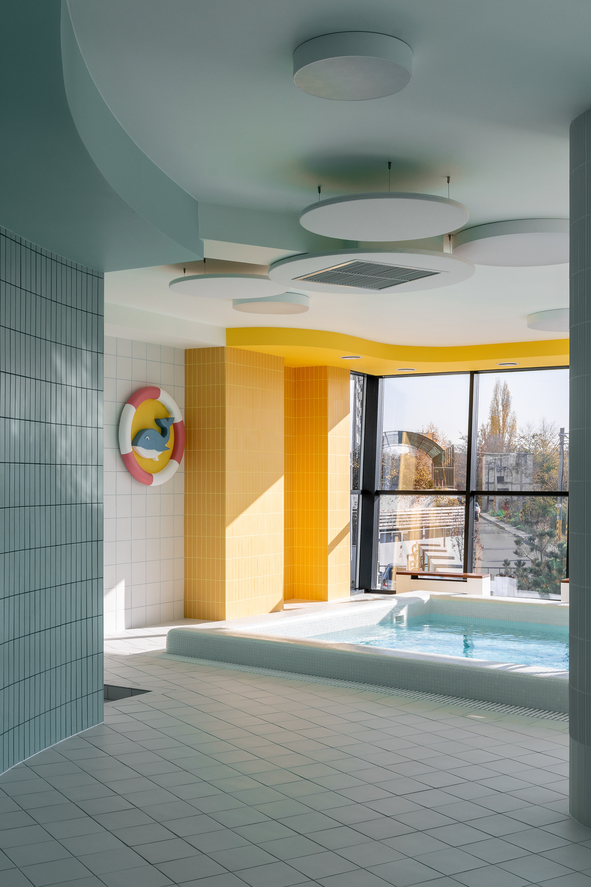Grădinița dispune de o piscină complet echipată, cu vestiare și dușuri separate pentru băieți și fete. Cu trei piscine concepute pentru diferite vârste și niveluri de abilități, facilităția promovează dezvoltarea fizică a copiilor. Accentele vibrante, elementele decorative și atmosfera luminoasă creează senzația că micuții înoată în ape cristaline, înconjurate de nisip auriu.
