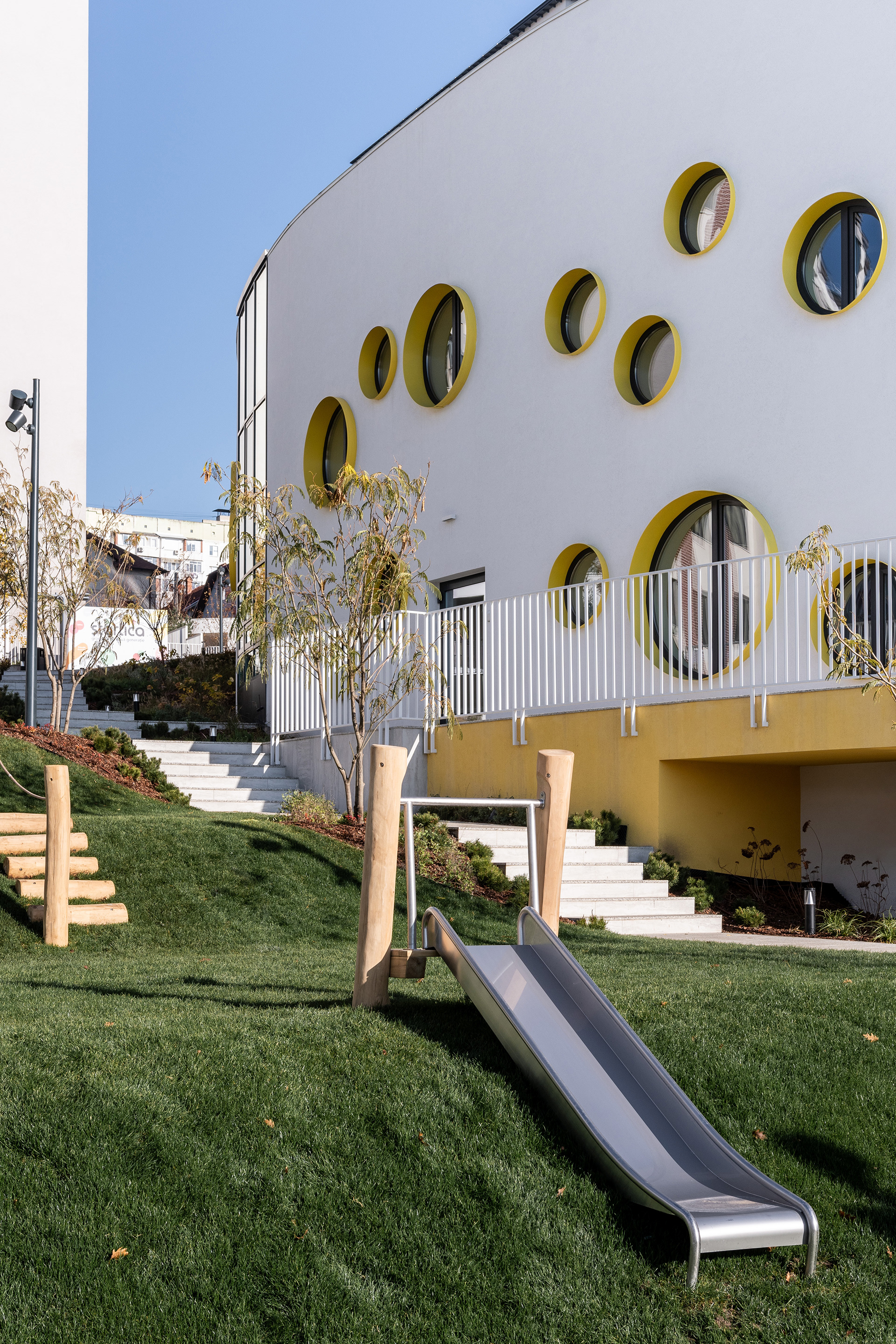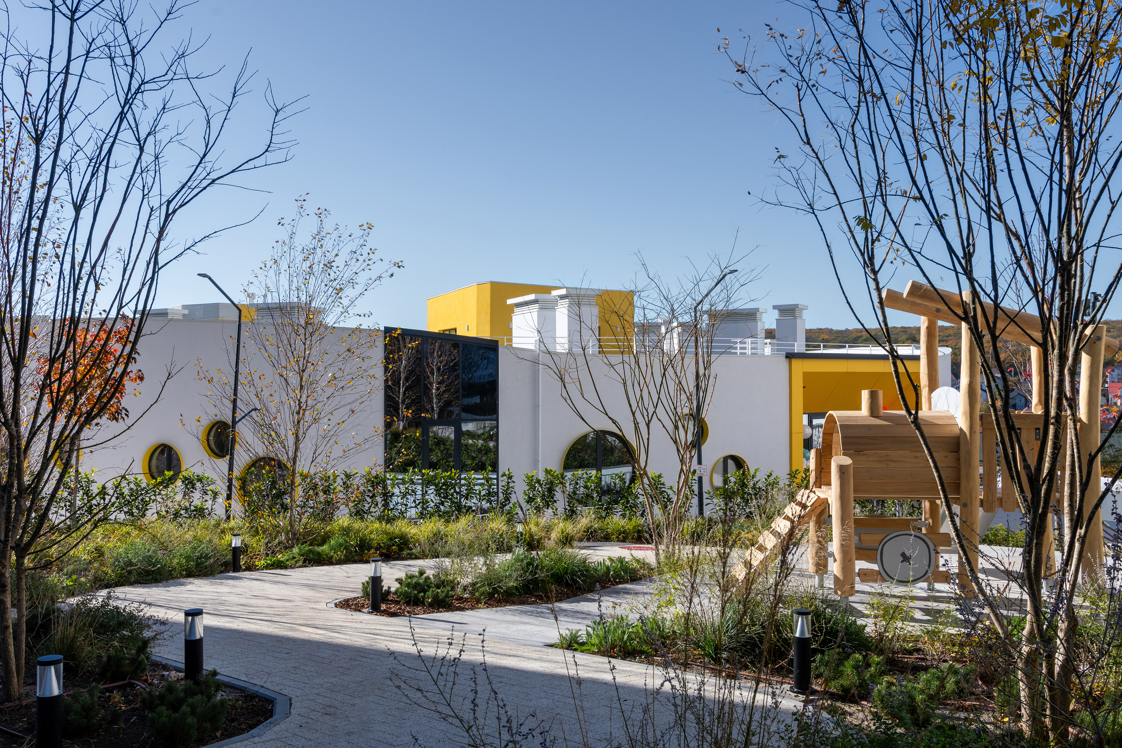 Spațiile exterioare au fost proiectate conform tendințelor actuale, promovând un mediu ecologic și adaptat dezvoltării motorii a copiilor. Terenurile de joacă păstrează relieful natural modelat, oferind o varietate de experiențe senzoriale și motorii, favorizând explorarea prin elemente naturale precum buturugi și denivelări controlate.