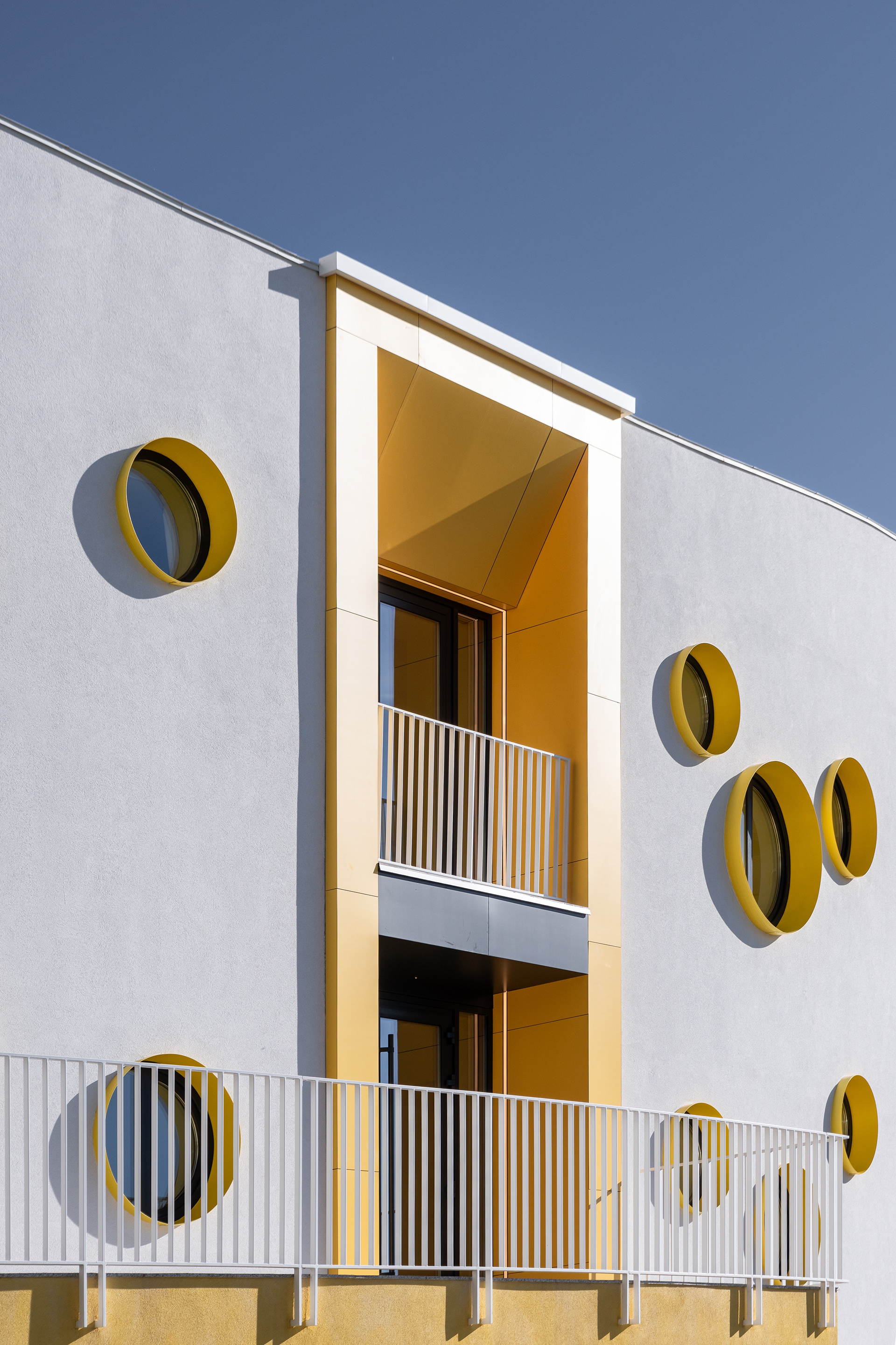 The project was taken over in a conservation phase on a rugged terrain with a 7-meter level difference. The adopted solution was to terrace the land, allowing for the harmonious integration of the building and outdoor spaces, reducing descent angles, and creating safe and accessible areas. Four distinct access points were provided at different levels to facilitate circulation flows.