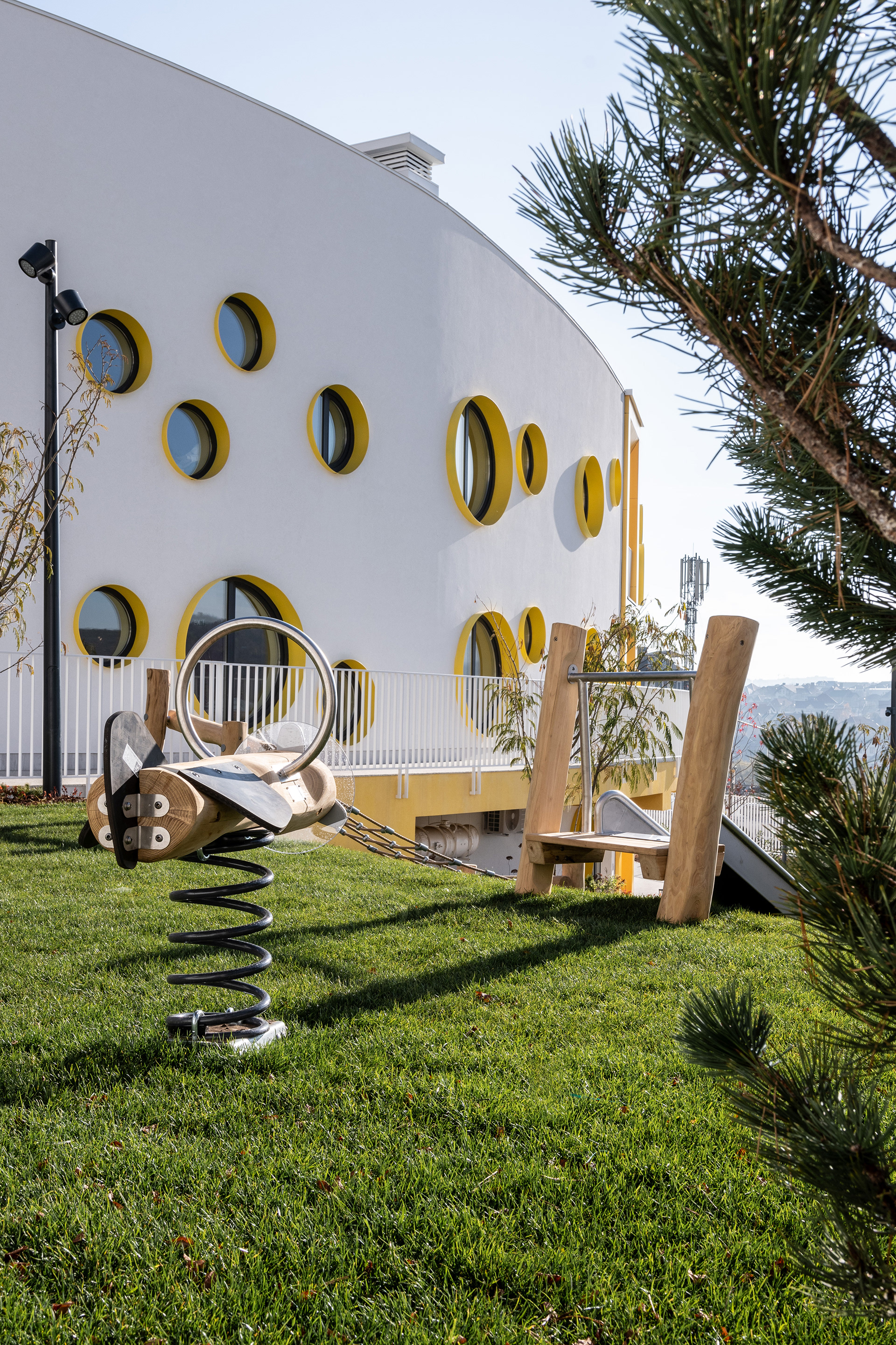 The outdoor spaces have been designed according to modern trends, promoting an ecological environment that supports children's motor development. The playgrounds preserve the natural terrain, offering various sensory and motor experiences, encouraging exploration through natural elements such as logs and controlled elevation changes.