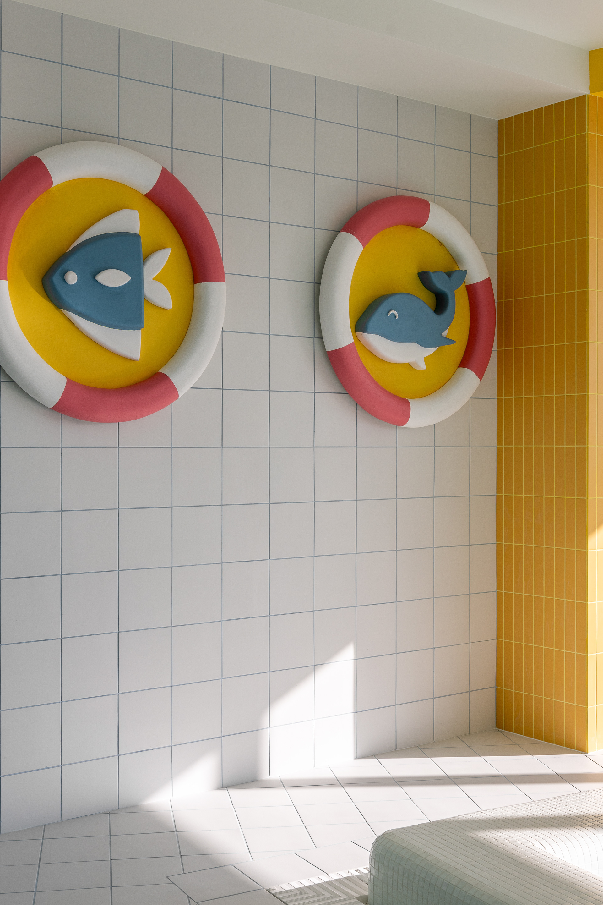 The kindergarten boasts a fully-equipped swimming pool, complete with separate changing rooms and showers for boys and girls. With three pools designed for various ages and skill levels, the facility promotes physical development for young children. Bright accents, decorative elements, and a sunlit atmosphere create the feeling that children are swimming in crystal-clear waters, surrounded by golden sand.