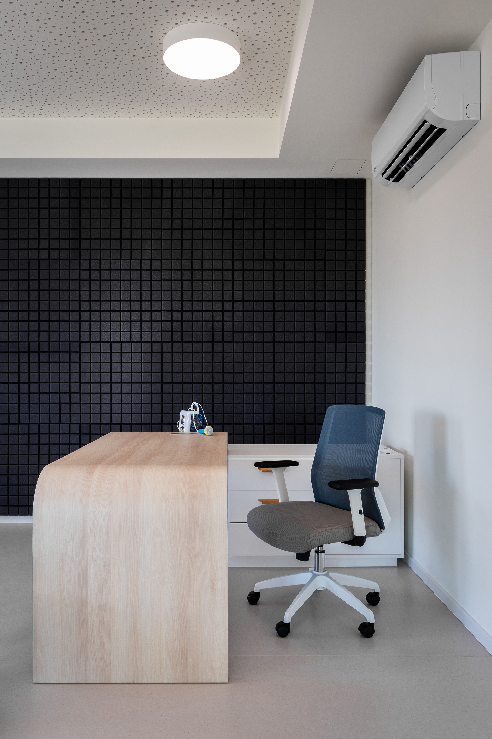The festive hall is thoughtfully divided into three distinct areas: a dance studio, a music room, and a spacious, bright hall with a semi-circular stage. This stage provides an ideal space for children to learn acting, perform, sing, and showcase their talents to their parents. The combination of wood, soft acoustic panels, mirrors, and carefully placed design elements creates a harmonious and functional environment.