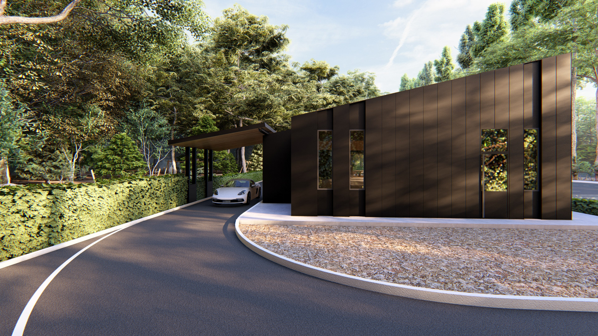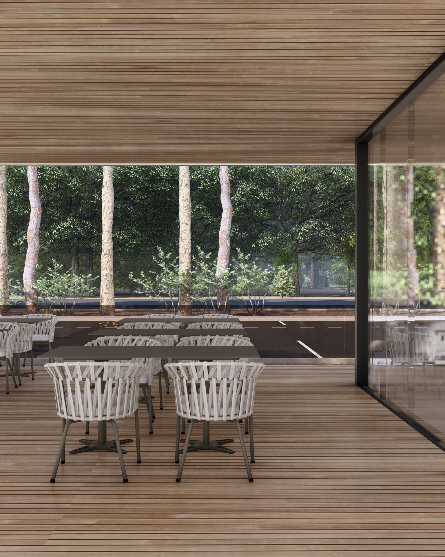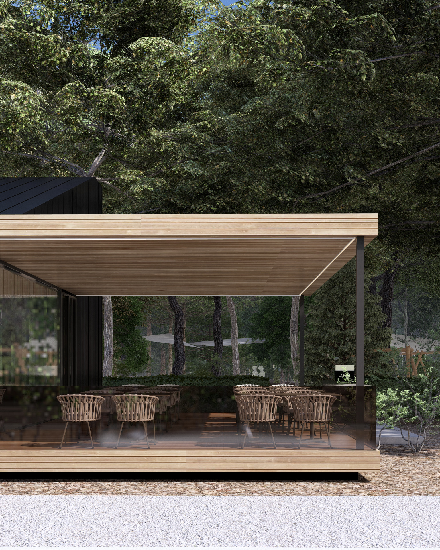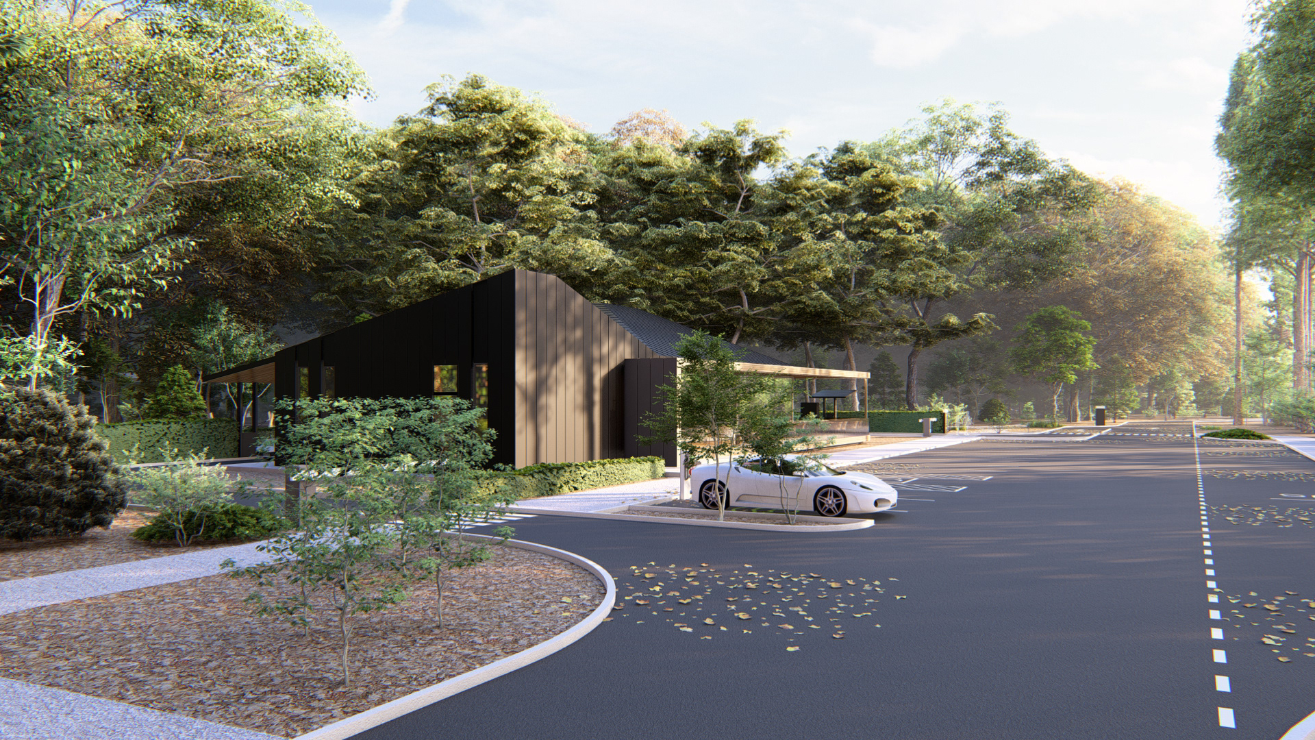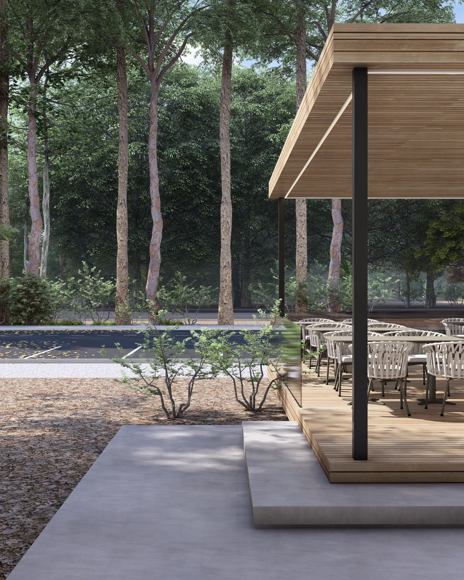 Beyond its immediate function, the project proposes an extended relationship with the site. Behind the building, the existing forest is activated through the creation of a park covering approximately one hectare, transforming a coffee stop into an experience of rest and reconnection with the natural environment.
