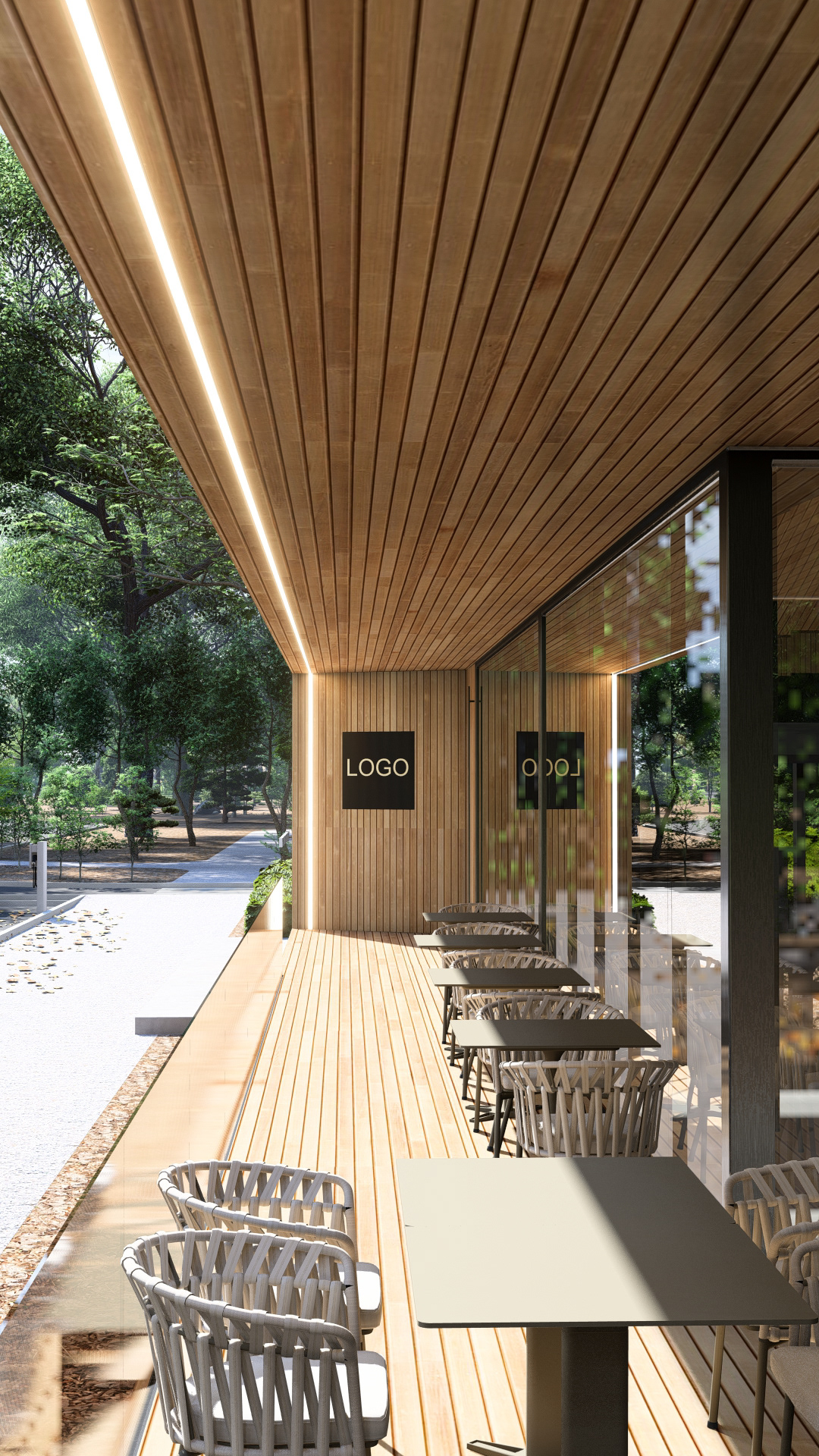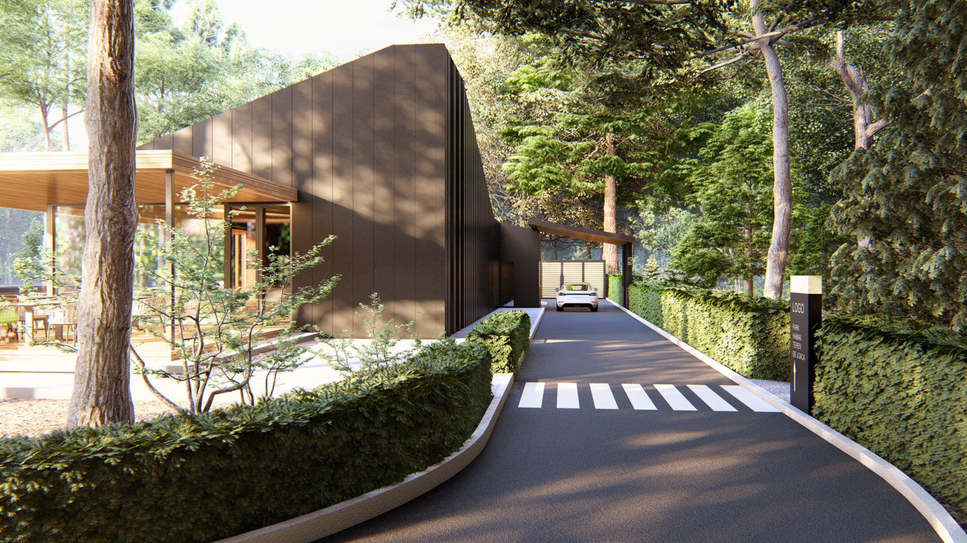 The café volume stands out through a dynamic yet restrained form that integrates naturally into the context. The timber structure, complemented by folded metal elements, defines a contemporary, clear, and functional architectural language.