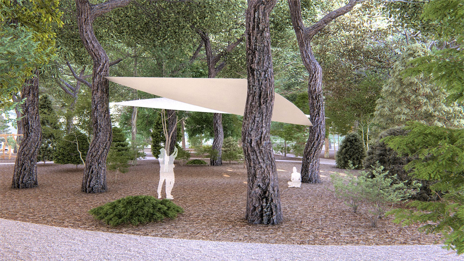 The park is structured as a sequence of spaces tailored to different types of use: playgrounds for children of various age groups, shaded areas created with textile canopies anchored to trees, hammock zones for relaxation, an open-air amphitheater, and walking paths weaving through the vegetation. Their layout was shaped by the existing topography and trees, with interventions carefully designed to avoid deforestation and preserve the site’s natural character.