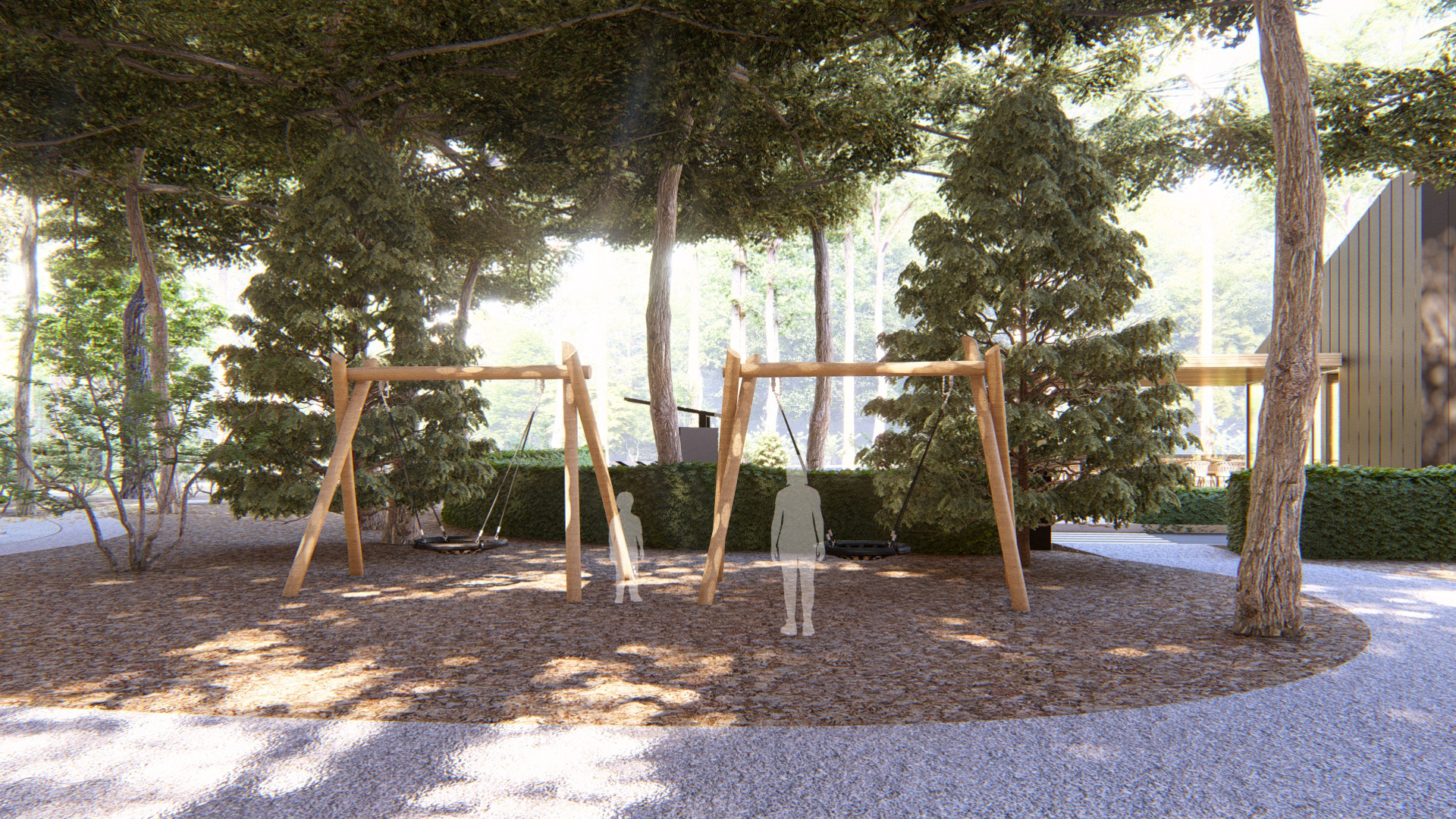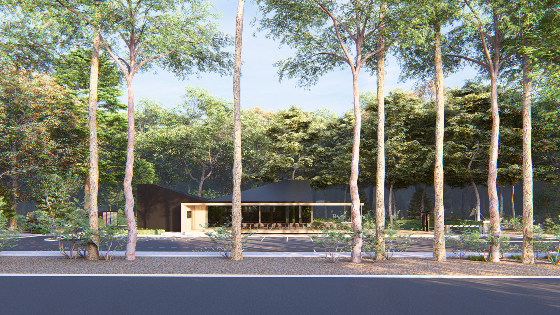 Dincolo de funcțiunea imediată, proiectul propune o relație extinsă cu situl. În spatele clădirii, pădurea existentă este valorificată prin amenajarea unui parc pe o suprafață de aproximativ un hectar, transformând oprirea pentru o cafea într-o experiență de repaus și reconectare cu mediul natural.