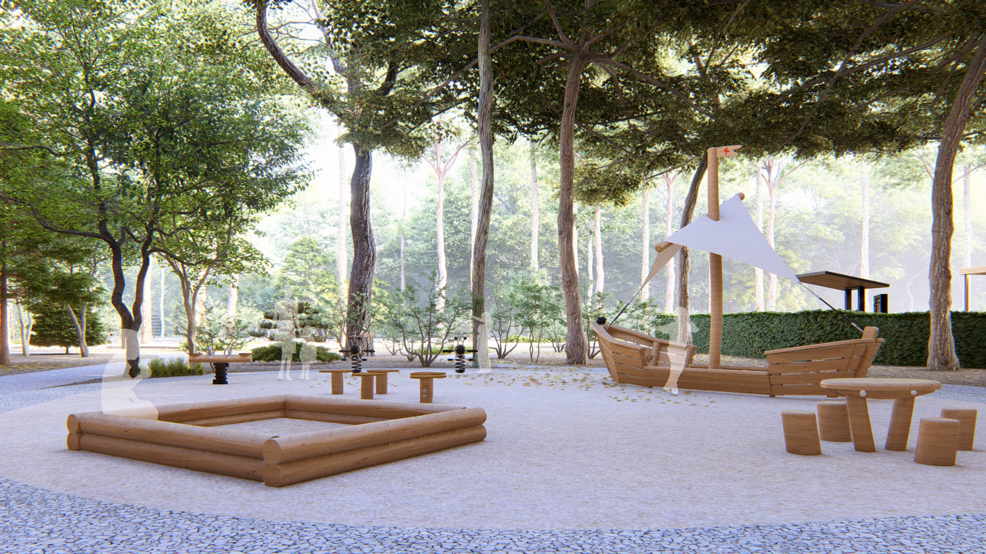 Parcul este structurat ca o succesiune de spații dedicate diferitelor tipuri de utilizare: locuri de joacă pentru copii, adaptate vârstelor diferite, zone de umbrire realizate din pânze textile ancorate de copaci, spații cu hamacuri pentru odihnă, un amfiteatru în aer liber și trasee de plimbare care traversează vegetația. Organizarea acestora a fost dictată de relieful și de arborii existenți, intervențiile fiind gândite astfel încât să evite defrișarea și să păstreze caracterul natural al sitului.